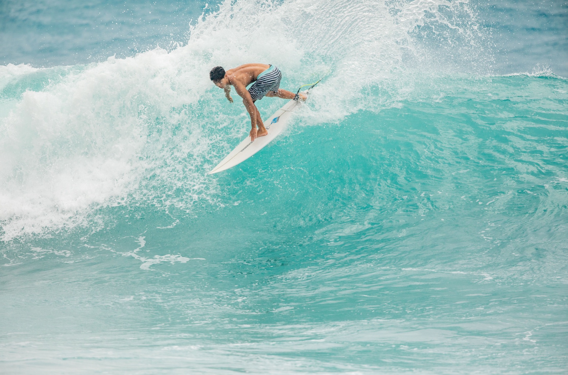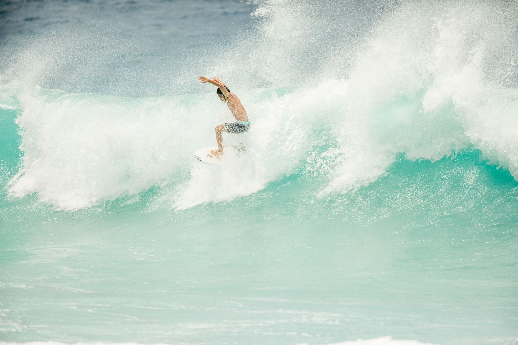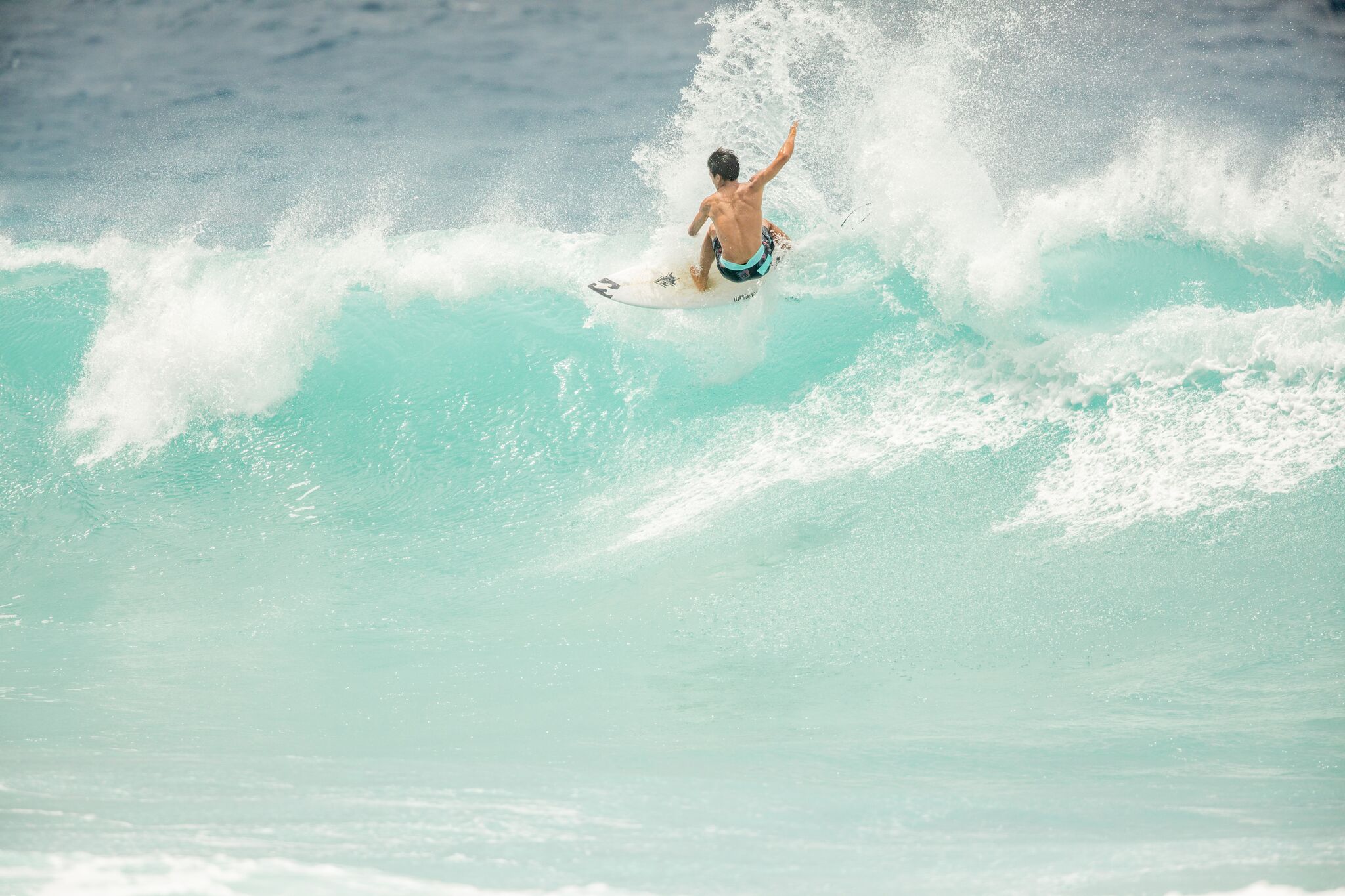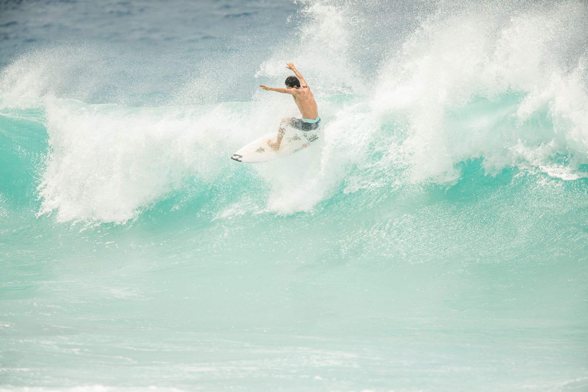 世界的なサーフィンの聖地ハワイの中でも指折りのブレイクであるサンセットを舞台とするサンセット・プロジュニアチャンプの金沢呂偉にとって、このママ下の波はファンウェイブでしかないに違いない。Roy Kanazawa.