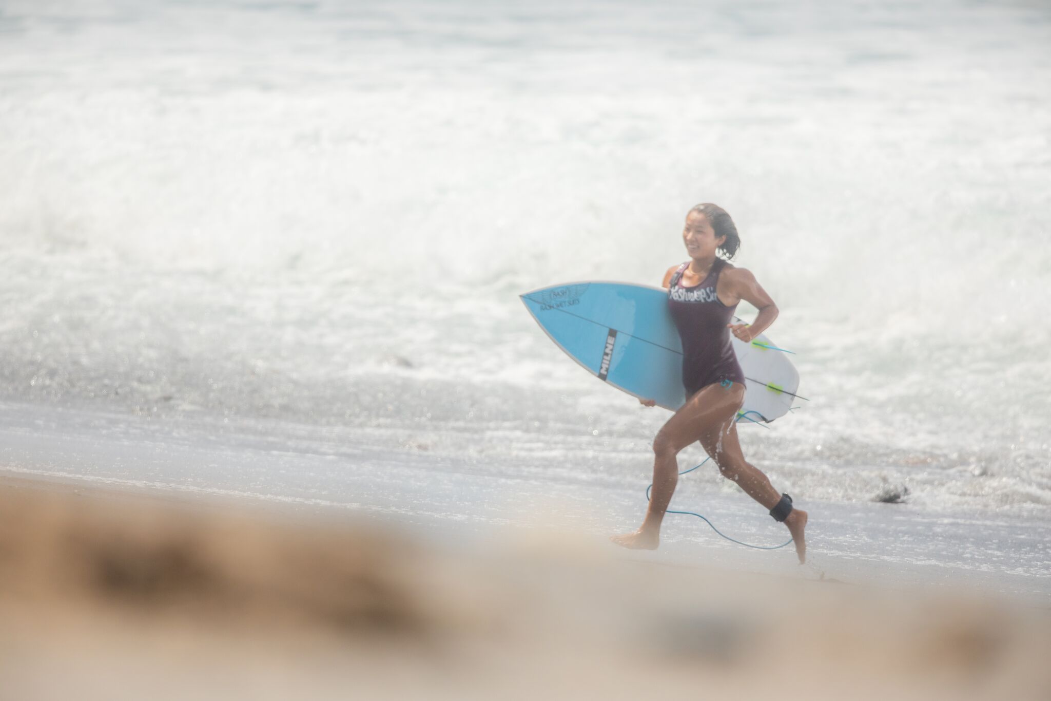 こういったハードコンディションにおいては、自分のタイミングを見計らって海に入ることが重要になる。時に他人のペースに飲まれて不安なまま海に入ると、ひどい目に遇うことも多々。ビーチでじっくりと波を見ながら、自分のタイミングを見計らう鈴木姫七と松永莉奈。Himena Suzuki & Rina Matsunaga.