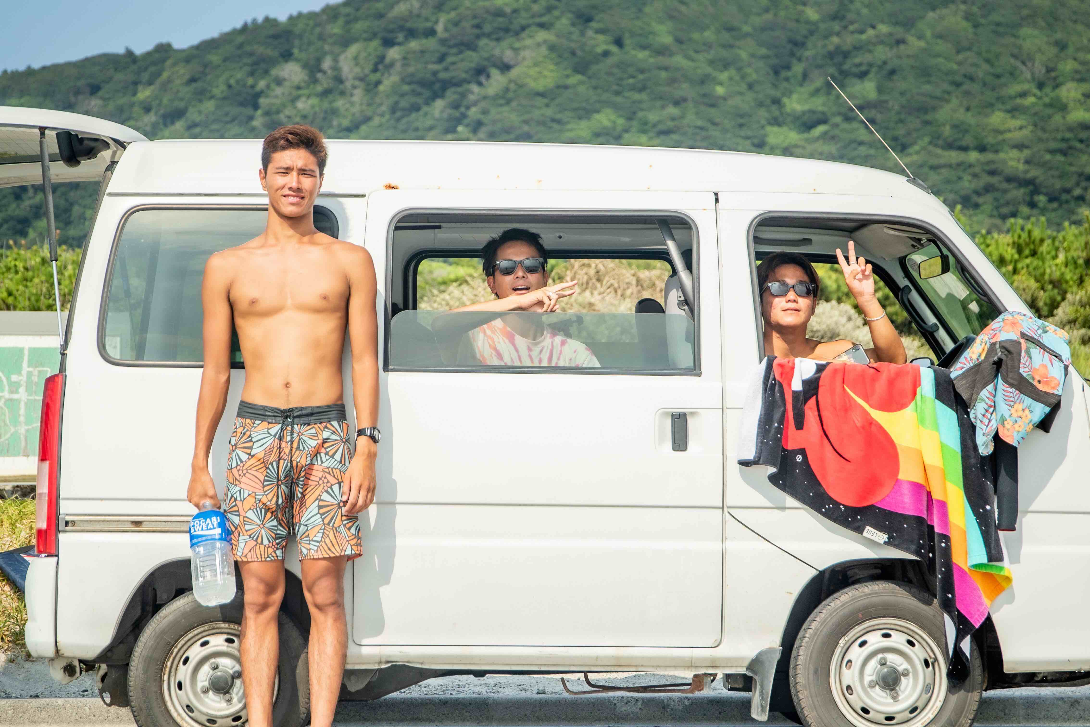 左から川俣海徳、笹子夏輝、村田嵐。新島らしい軽トラで観戦しつつ、自分たちのヒートまでリラックスタイム。From Left : Kaito Kawamata, Natsuki Sasako, Arashi Murata.