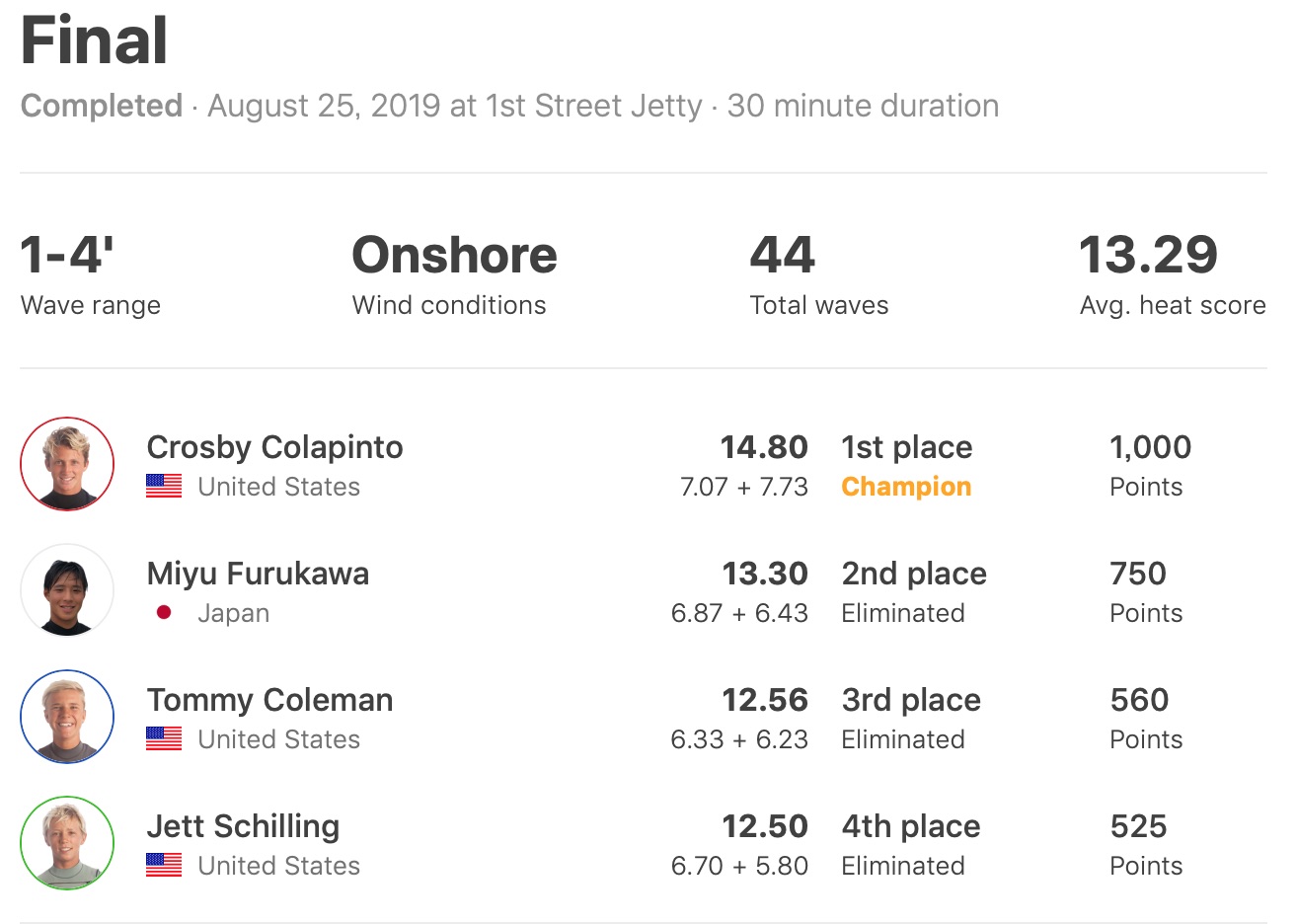 日本人選手たちの活躍は同Pro Juniorで安室丈がクォーターファイナルのヒート4で古川海夕とBrondi Saleに敗退となり9位でフィニッシュ。
