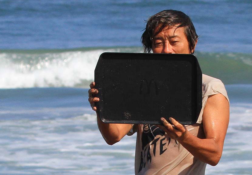 colorsmagもサーフィンはもちろん写心、文章だけにとどまらず、幼い頃から多くを学び、未だ大きな影響を受け続けている人生の師匠であるそんな彼が、なんとマクドナルドのトレーで波に乗ることに成功した!