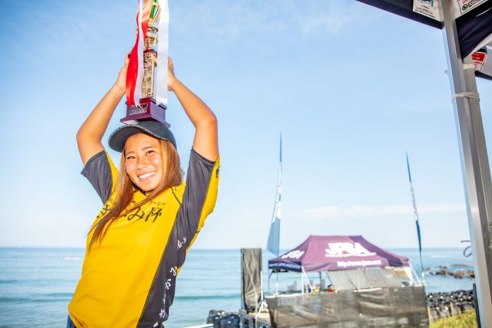 6本目に掴んだグーフィーのセットで7.50ptを叩き出し、見事な優勝を勝ち獲った渡辺愛。兄でトッププロサーファーの渡辺寛と大先輩であり、歴代グランドチャンプのひとりである辻裕次郎に担がれ、自身にとってJPSAでの初勝利の味を噛みしめる。おめでとう!!Mana Watanabe.