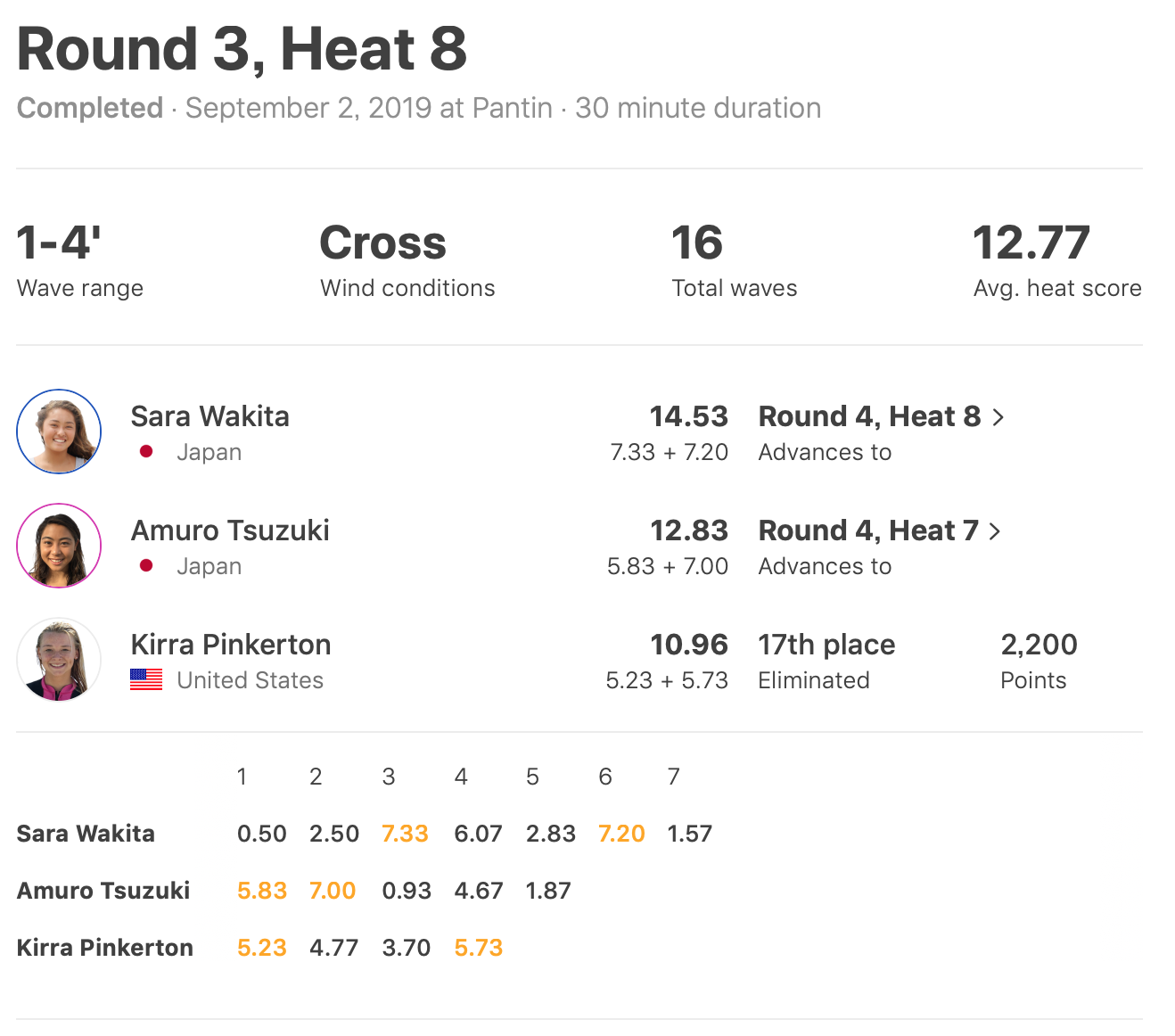 さらにヒート8で同じヒートに組み込まれてしまった脇田沙良と都筑有夢路はKirra Pinkertonを抑えて、7.33ptと7.20ptをまとめた脇田沙良が1位で、都筑有夢路が2位でラウンド4進出を果たした!