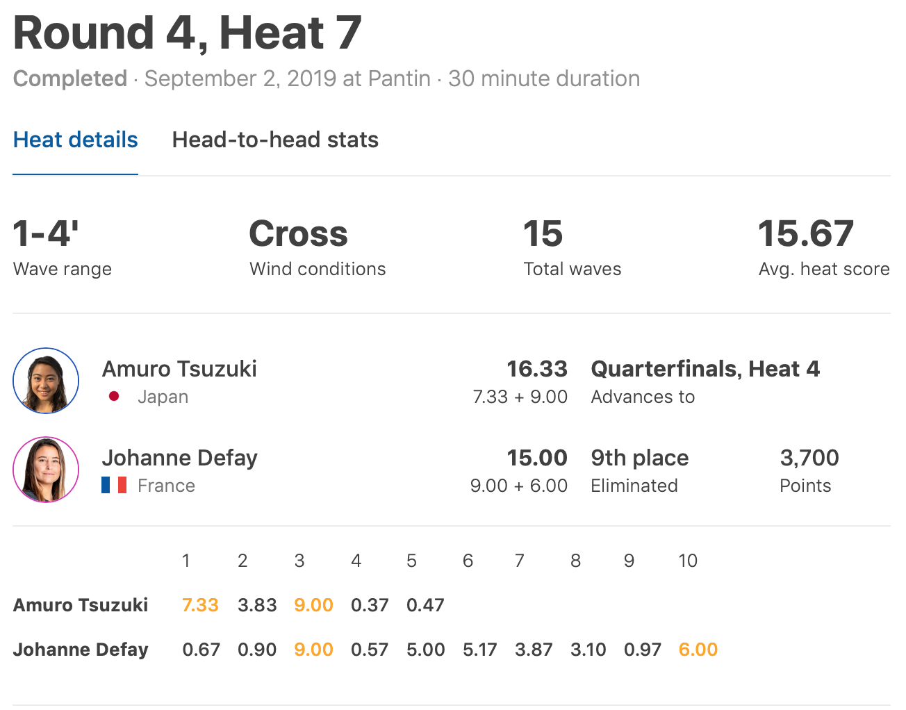 最後まで逆転を狙うJohanne Defayが10本目の波をつかんだものの6.00ptと逆転に至らず、見事都筑有夢路がクォーターファイナル進出を果たした!