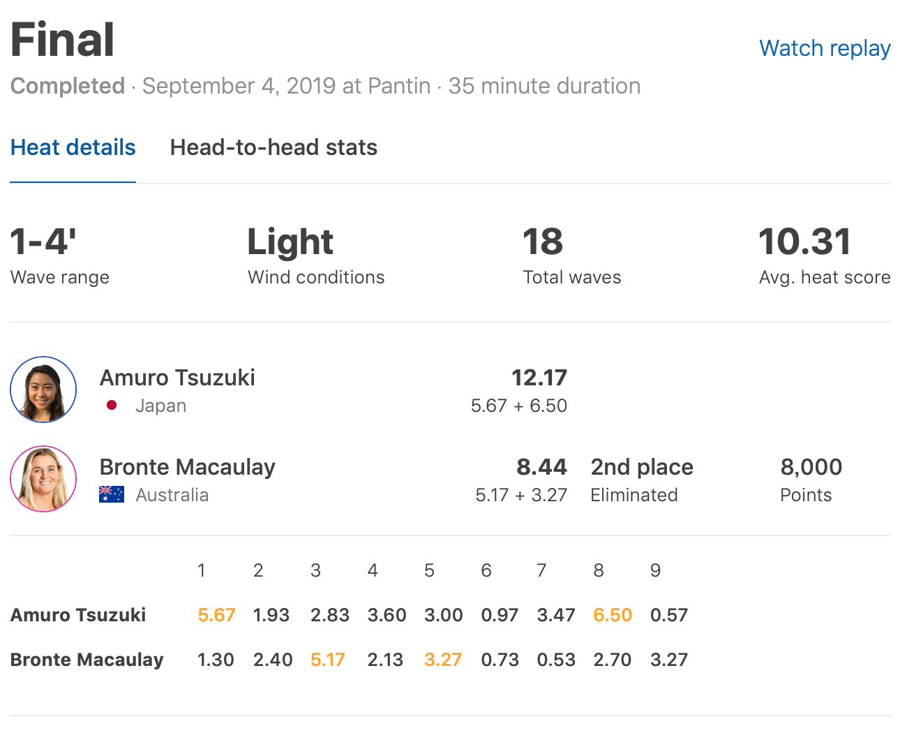 都筑有夢路がリードを保ったまま掴んだ8本目の波では6.50ptを叩き出してさらにトータルスコアを伸ばし、見事このハイレベルな戦いを制した!