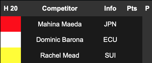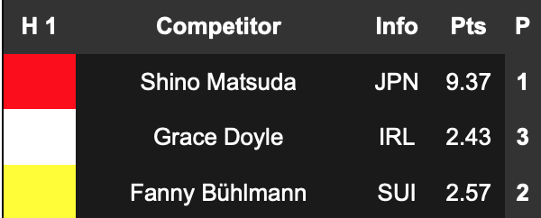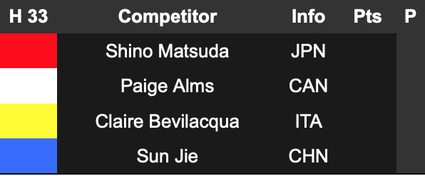 迎えるラウンド2のヒート33では松田詩野がPaige Alms(CAN)、Clair Bevilacqua(ITA)、Sun Jie(CHN)と対戦。