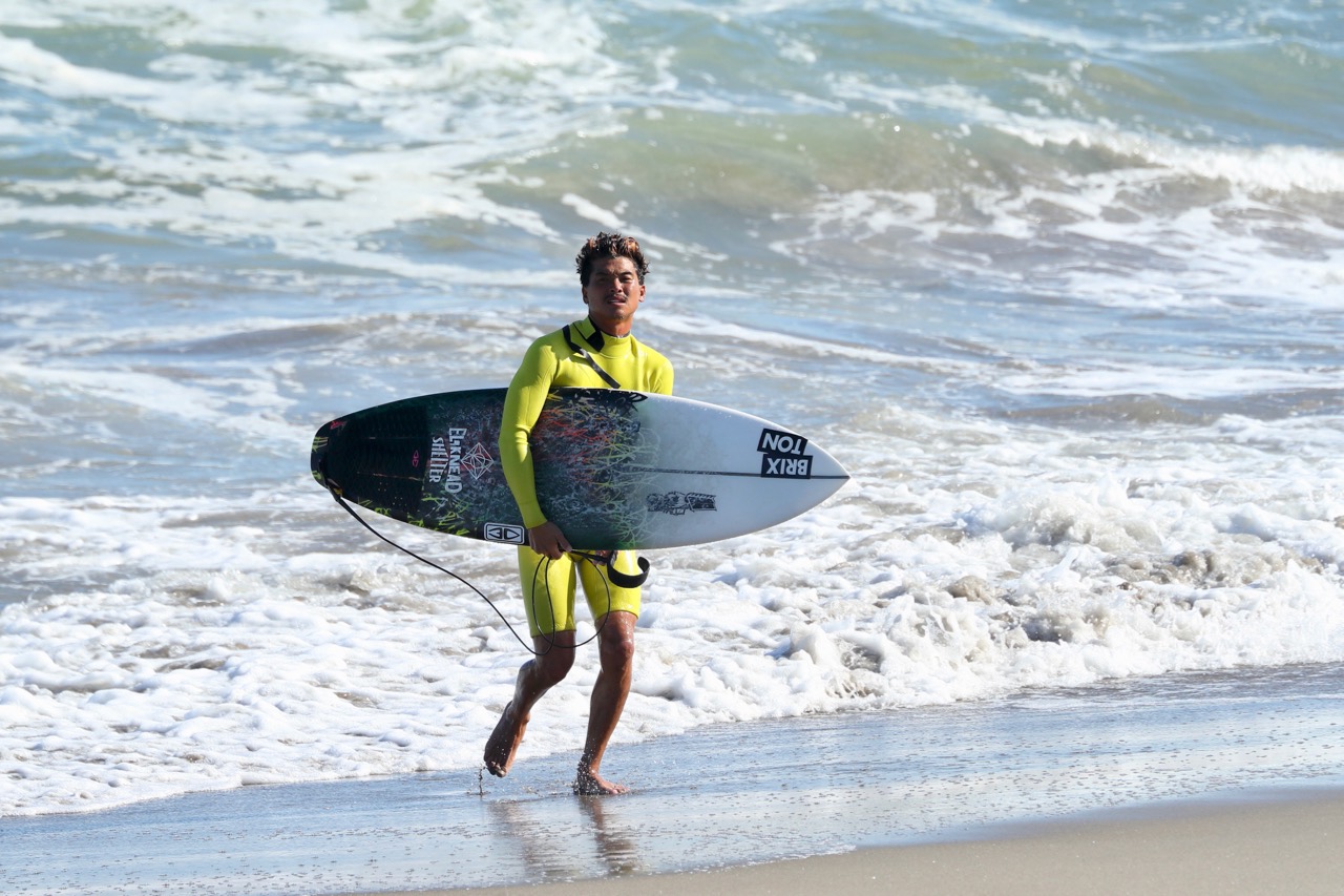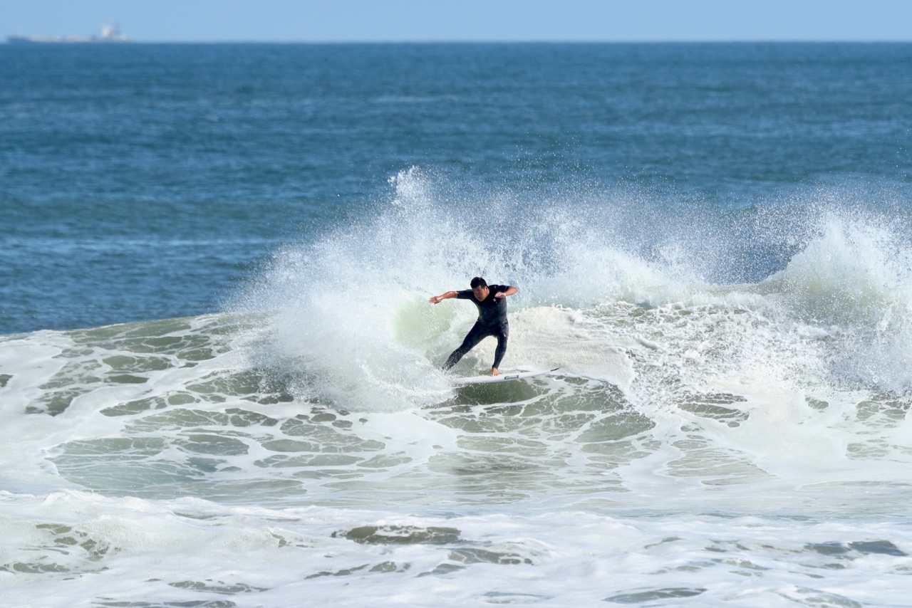 仙台出身の同じプロサーファーで、仲良しの松岡慧斗が帰ってきて急いで仕事から海に駆けつけてきた小嶋翼。Tsubasa Ojima.