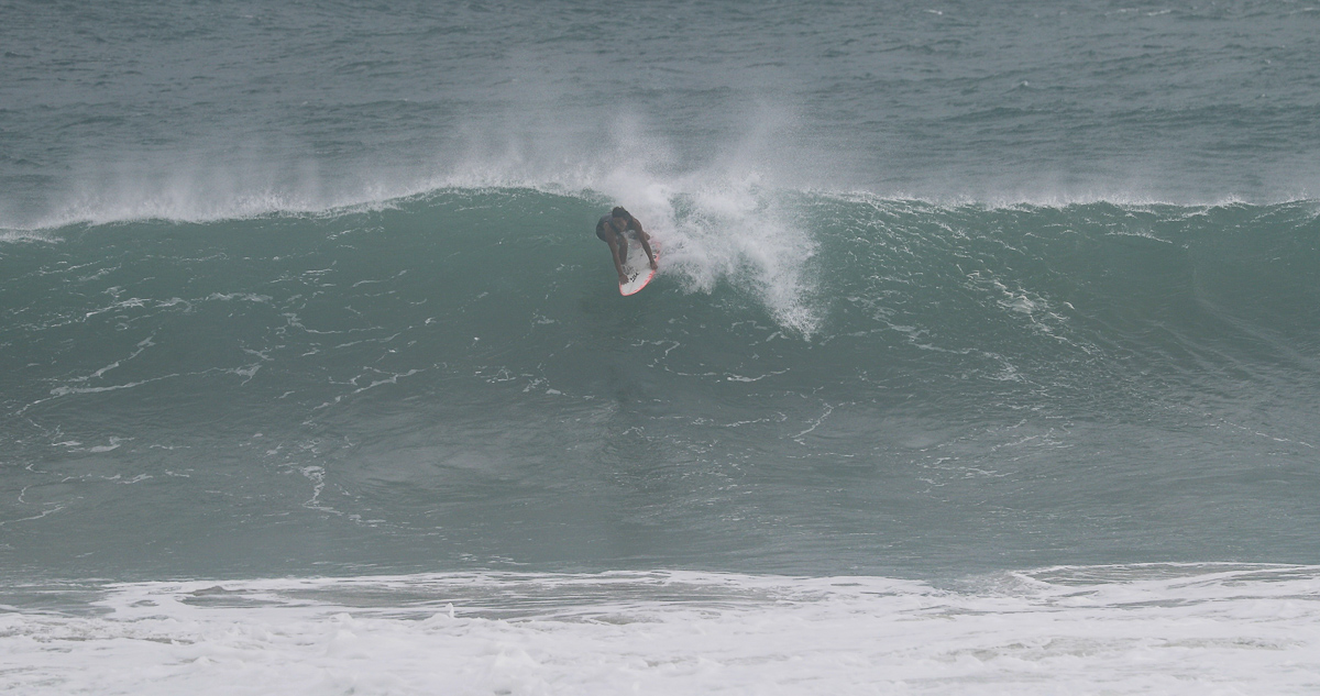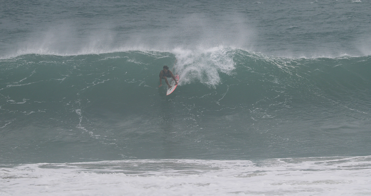 会場となっていた9/20(金)のホテル前ポイントは、台風17号の影響によってダブルオーバーまでサイズアップを果たし、夕方にはオフショアで波が整い、6ftオーバーの巨大セットが押し寄せるハードコンディションと化した。