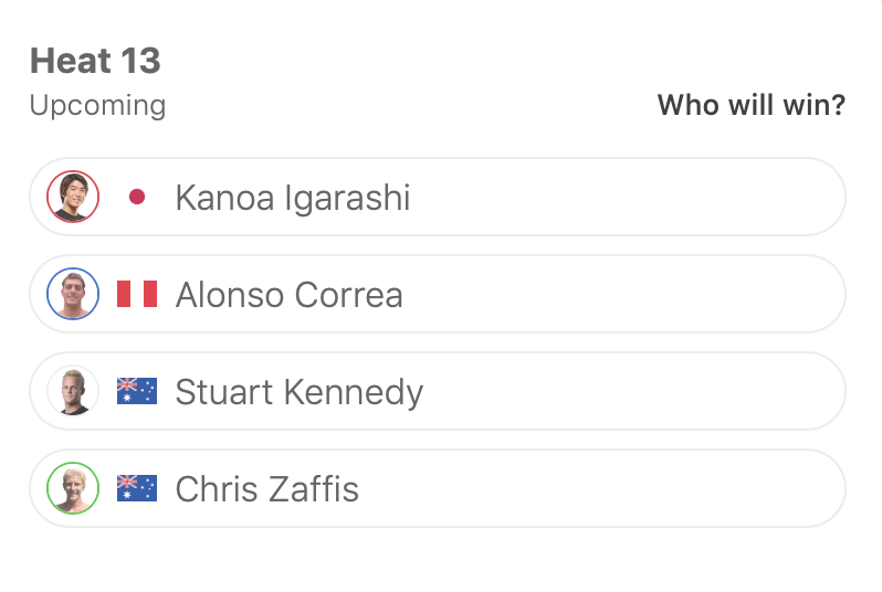 Alonso CorreaとChris Zaffisに元CTサーファーのStuart Kennedyと対戦。