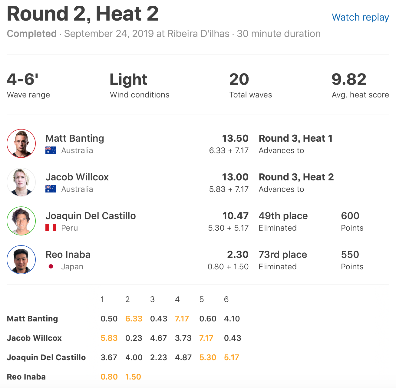 注目の日本人選手の活躍は、ラウンド2のヒート2でMatt BantingとJacob Willcox、Joaquin Del Castilloと対戦した稲葉玲王が全くいい波をつかむことができず、惜しくもここで敗退。