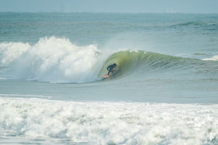 左奥の高速チューブを駆け抜けてくるのは宮崎出身で現在はこのエリアに拠点を置く渡辺寛。彼の宮崎でのホームブレイクの波自体がチュービーでパワフルなビーチブレイクであるだけに、こういったコンディションではいつも以上にその真価を発揮する本格派。Kan Watanabe.