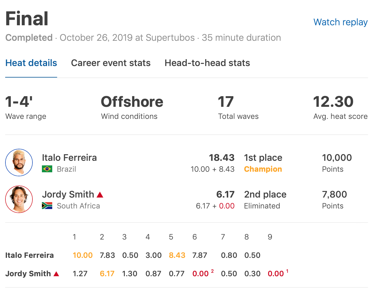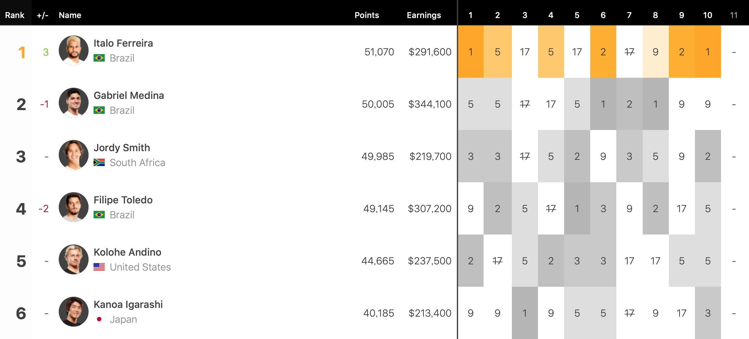 この一勝によりItalo FerreiraはCTランキング1位に躍り出た。