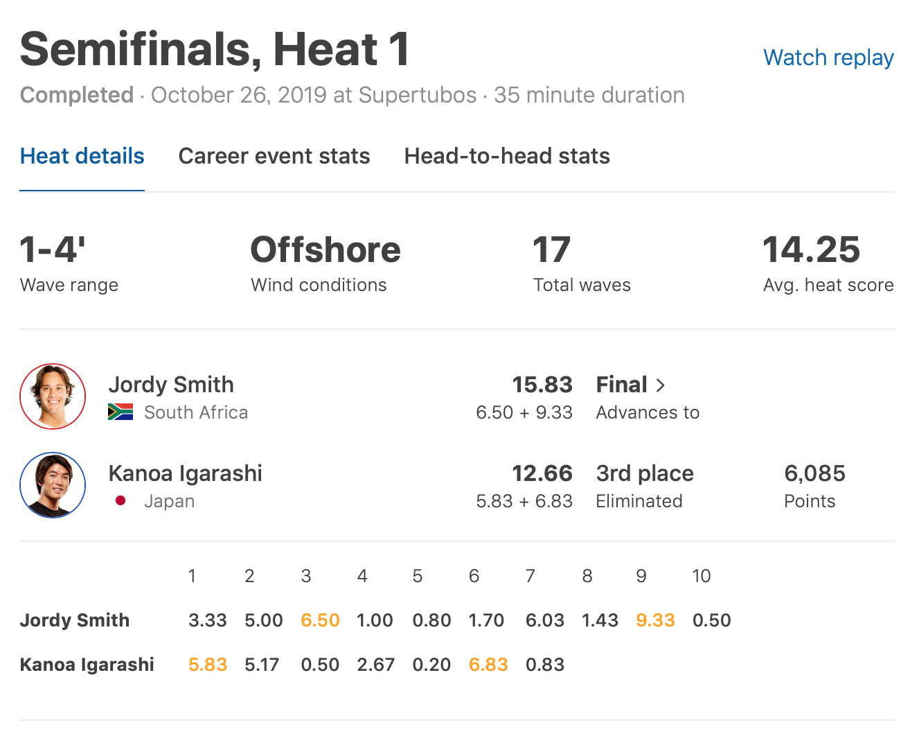 この時プライオリティーを持っていた五十嵐カノアは、Jordy Smithがこの波を掴むことを阻止することができたが、インサイド気味のスコアポテンシャルがなさそうに見える波だったことから、五十嵐カノアはこの波をJordy Smithに乗らせてしまい、その判断一つが敗因となってしまった。