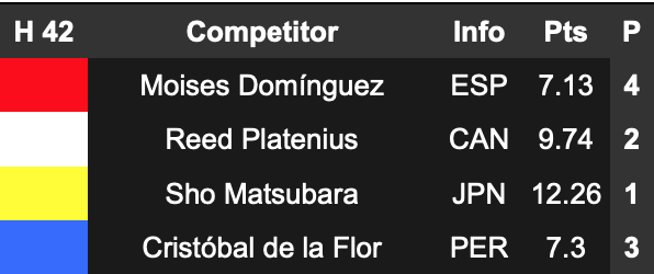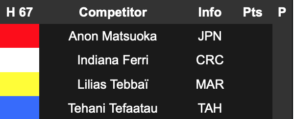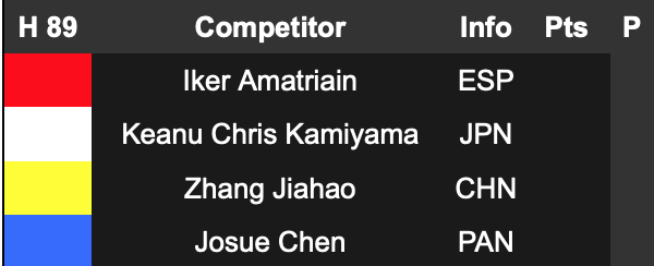 昨年の金メダリストである上山キアヌはヒート9でLker Amartain(ESP)、Zhang Jiahao(CHN)、Josue Chen(PAN)と対戦予定となっている。