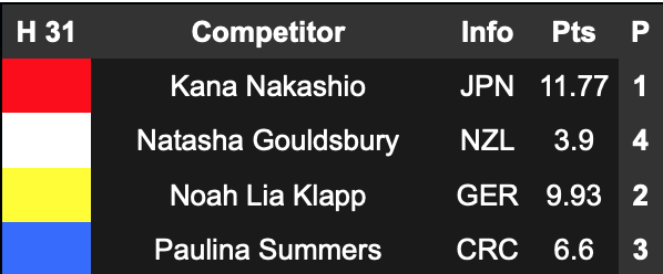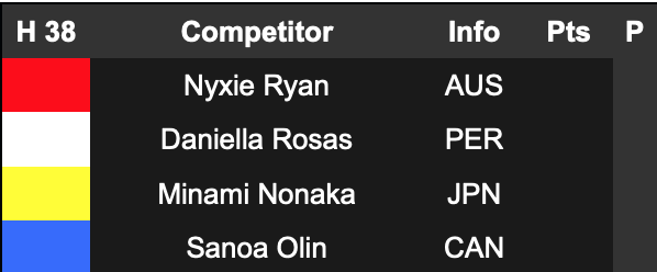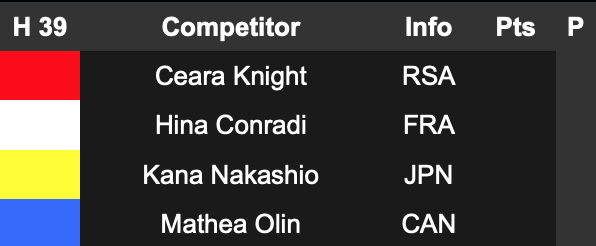 ヒート3では中塩佳那がCiara Knight(RSA)、Hina Conradi(FRA)、Mathea Olin(CAN)と対戦予定となっている。