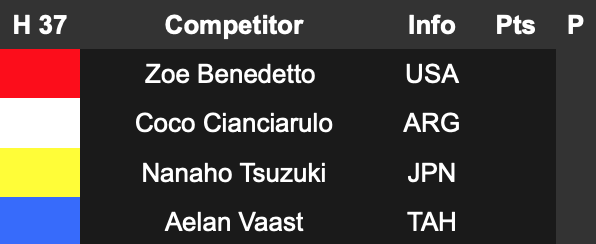 迎えるメインラウンド3では、都築虹帆がヒート1でZoe Benedetto(USA)、Coco Cianciarulo(ARG)、Alan Vaast(TAH)と対戦。