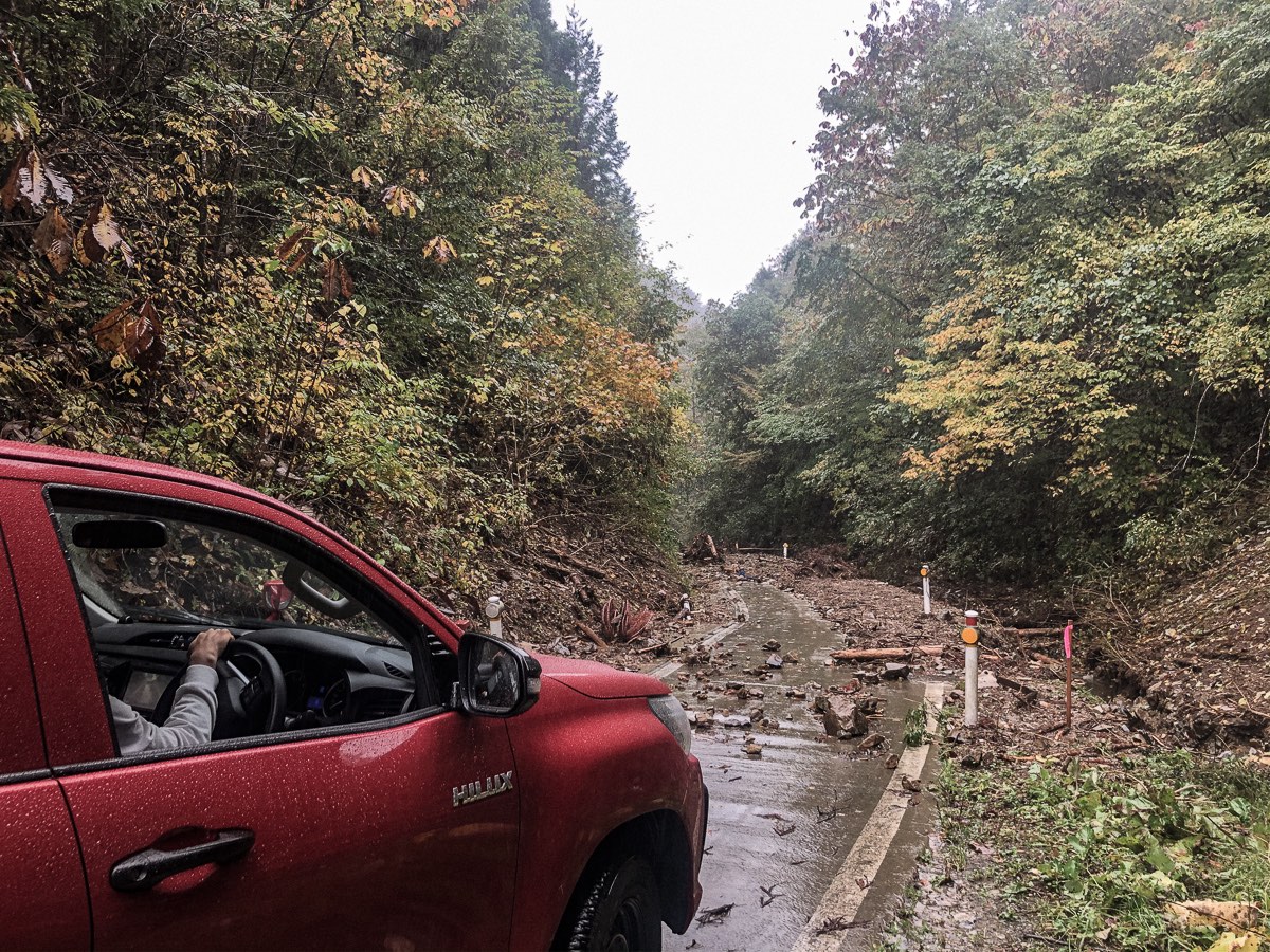しかし、斜度が急なセクションに到達すると、道路に散乱する落ち葉や土砂でスリップしやすくなっていた路面にタイヤが空回り気味になってしまう場面もあり、しかも通行止のサインがこの道の入り口になかったことから、この土砂崩れはかなりフレッシュであることは容易に想像でき、そんな自分たちが置かれている状況に無言の緊迫した空気に包まれる。