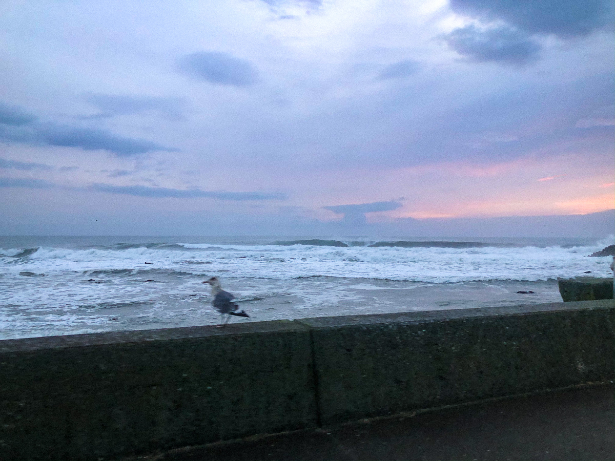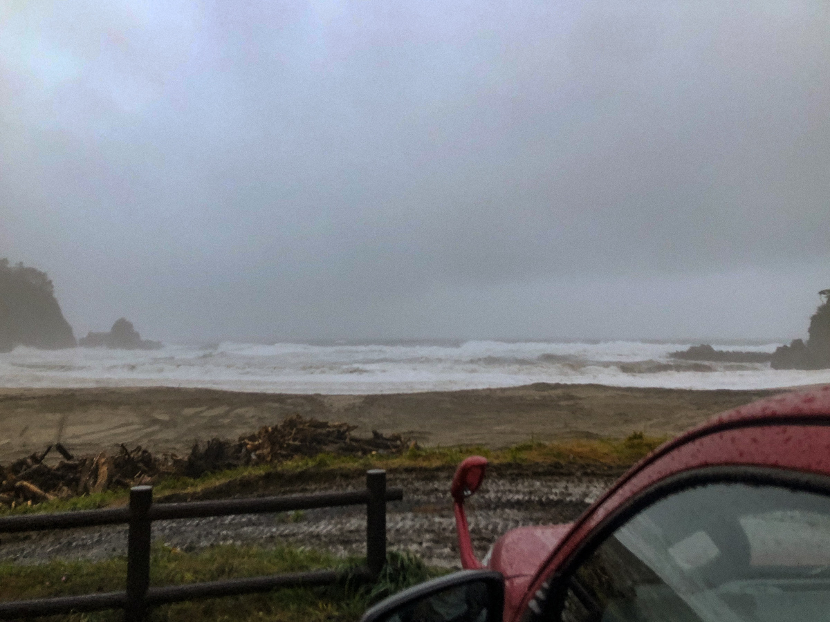 地元で採れた魚を素材とする定食屋で昼食をすませると、しかし雨も風も全く止む気配はなく、16:00くらいまで先ほどの小さな湾に河口がある海の目の前に車を停めて雨と風が止むタイミングを待つことに。