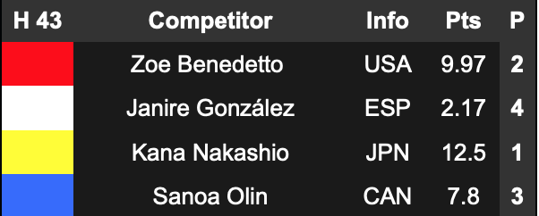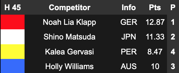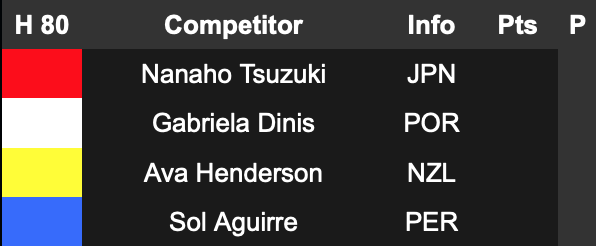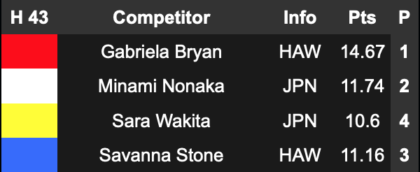 さらにこの日はヒートが行なわれなかった都築虹帆はリパチャージラウンド4のヒート1でGabriela Dinis(POR)、Ava Henderson(NZL)、Sol Aguirre(PER)と対戦。