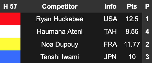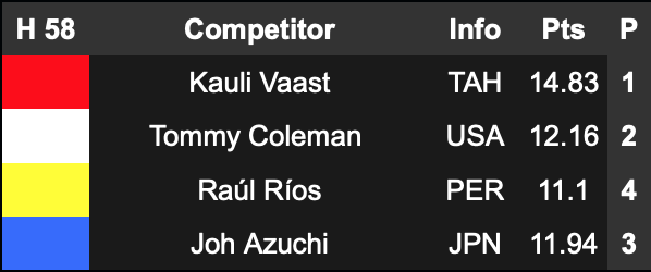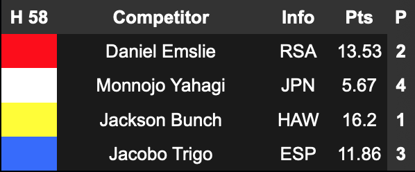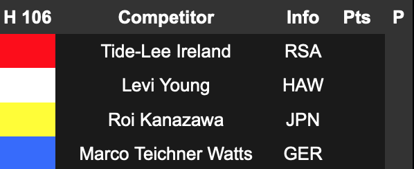 リパチャージラウンド4のヒート2へと駒を進め、Tide-Lee Ireland(RSA)、Levi Young(HAW)、Marco Teacher Watts(GER)と対戦予定となっている。