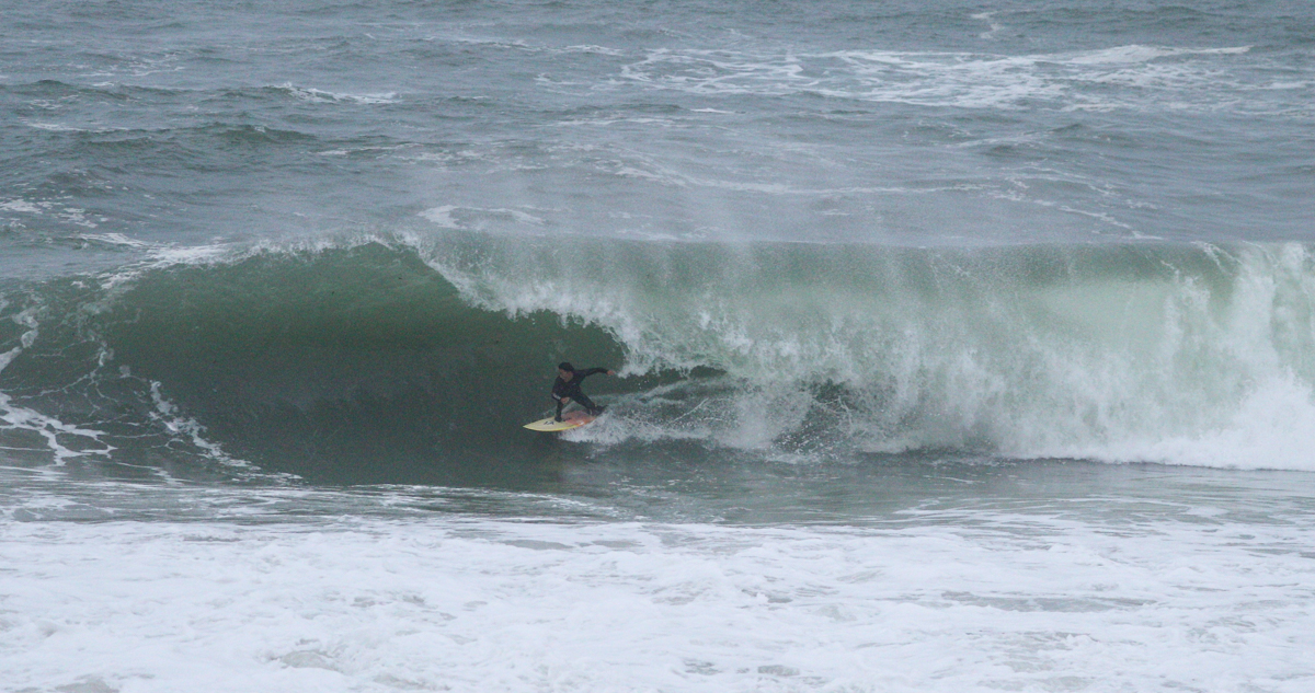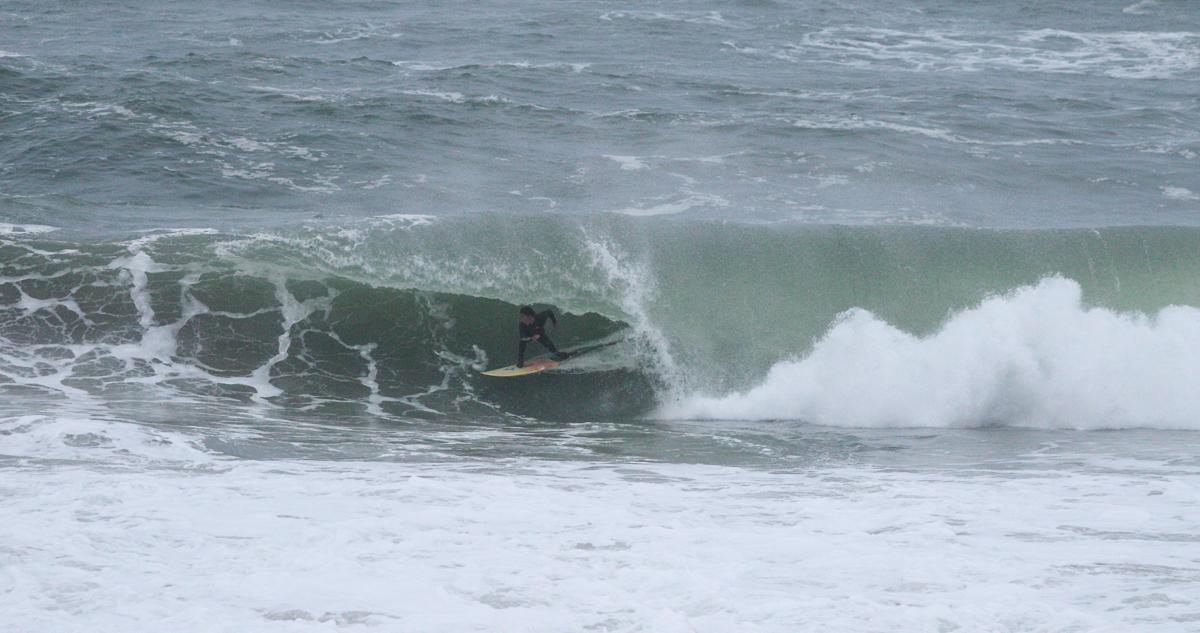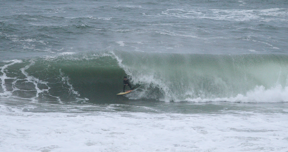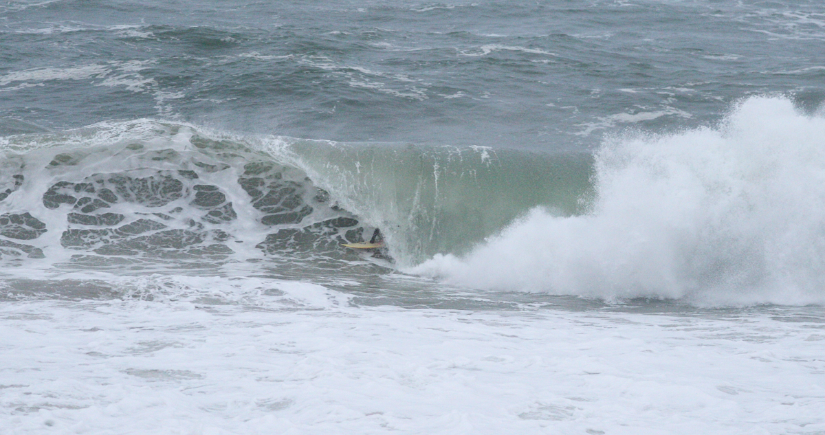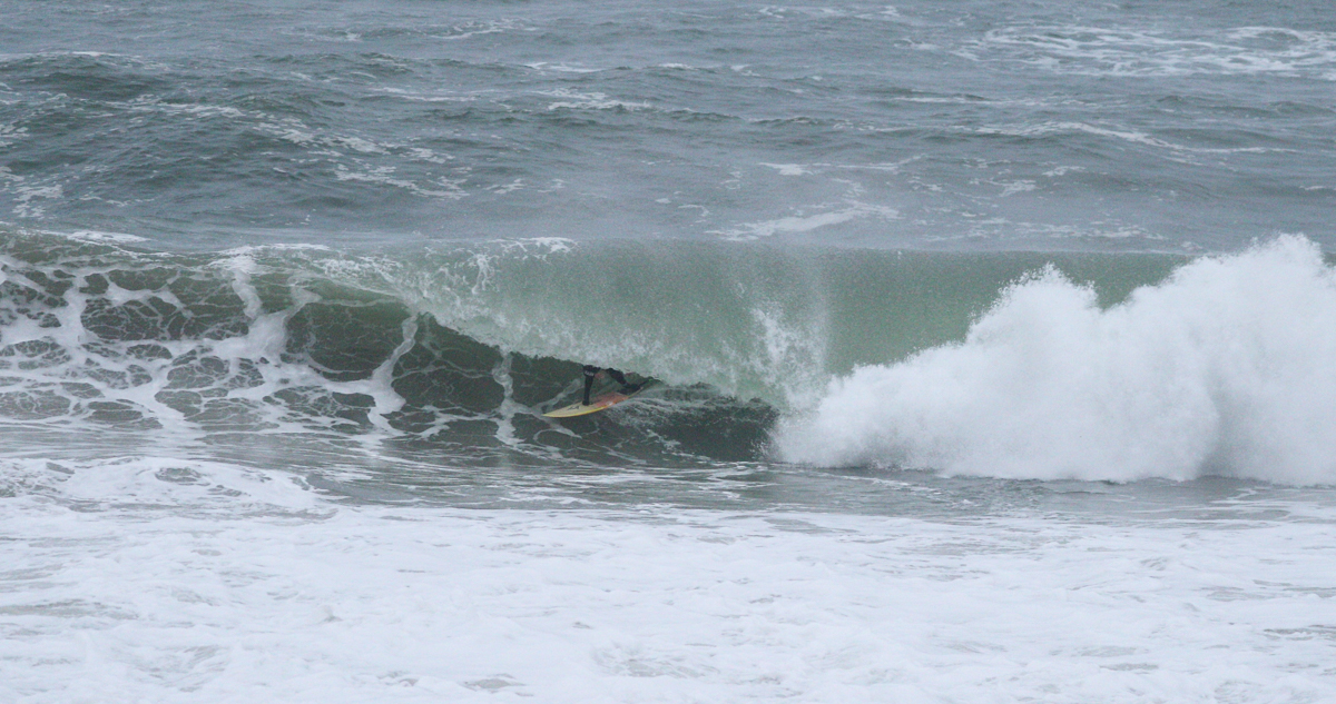 波は予想に反してスペシャルとはならなかったものの、オンショアが吹き荒れる中、風にも負けないパワフルなうねりがインサイドのサンドバーにヒットし、グリグリのチューブを形成。