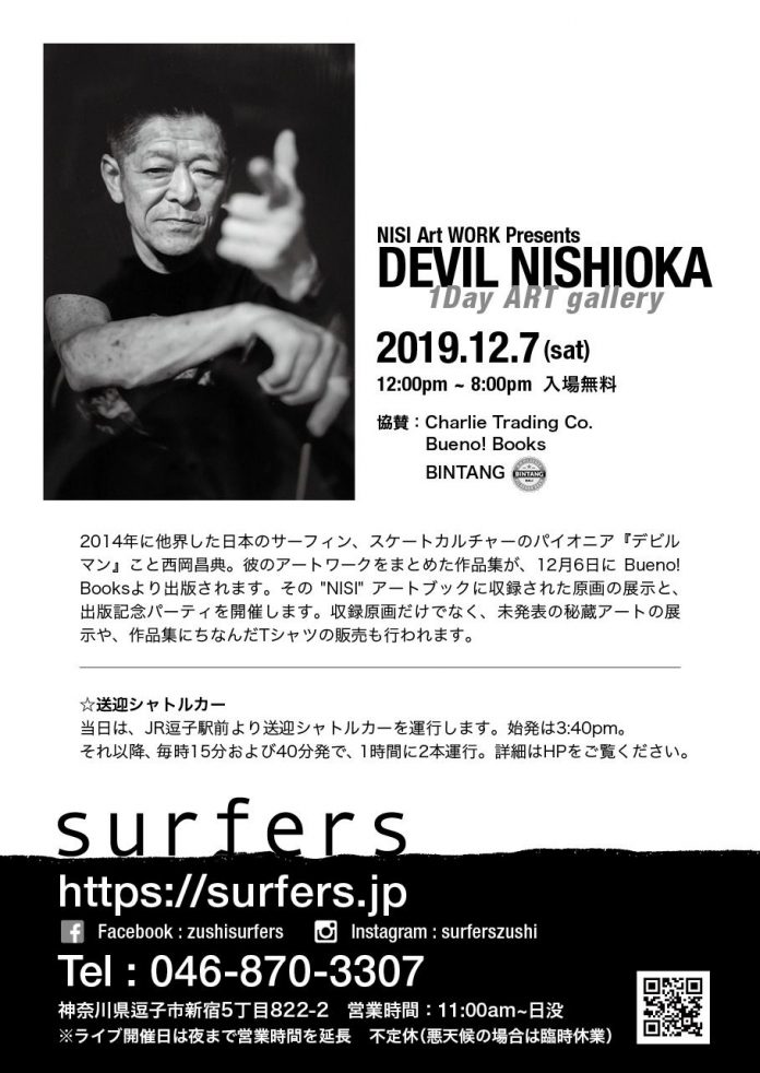 それを記念し、デビル西岡氏とゆかりの深い逗子SURFERSにて、”DEVIL NISHIOKA 1DAYアートギャラリー”が開催されることが決定!