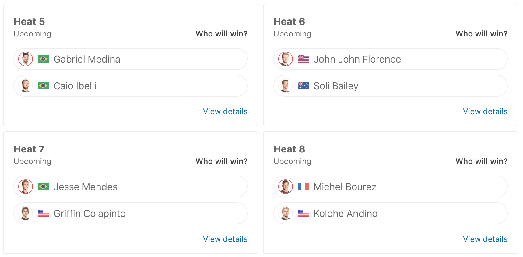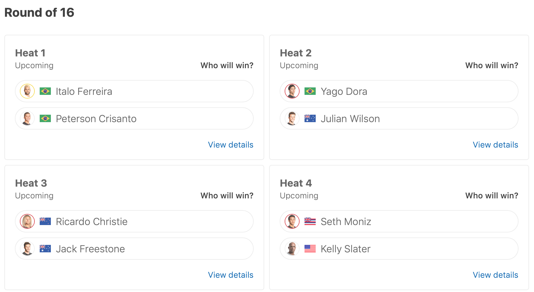 迎えるラウンドオブ16ではItali Ferreiraがヒート1でPeterson Crisantoと、Gabriel Medinaがヒート5でCaio Ibelliと、Kolohe Andhinoがヒート8でMichel Bourezと対戦予定。