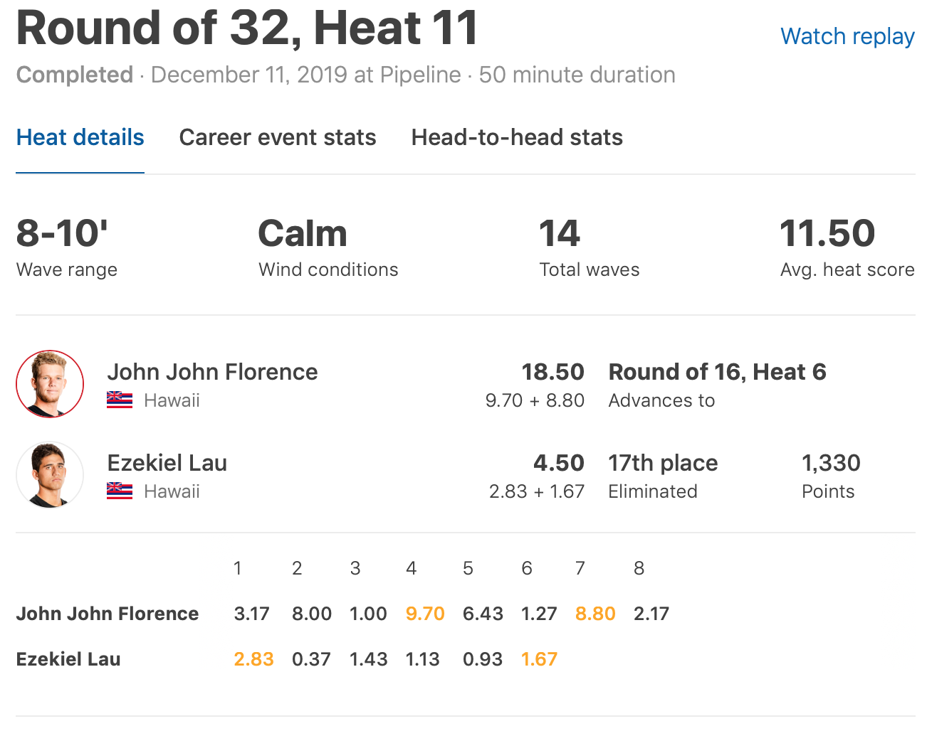 また2020年東京オリンピックのアメリカ代表の座をかけたKelly SlaterとJohn John Florenceの戦いは、共にハイスコアを叩き出して順調にラウンドオブ16へラウンドアップ。