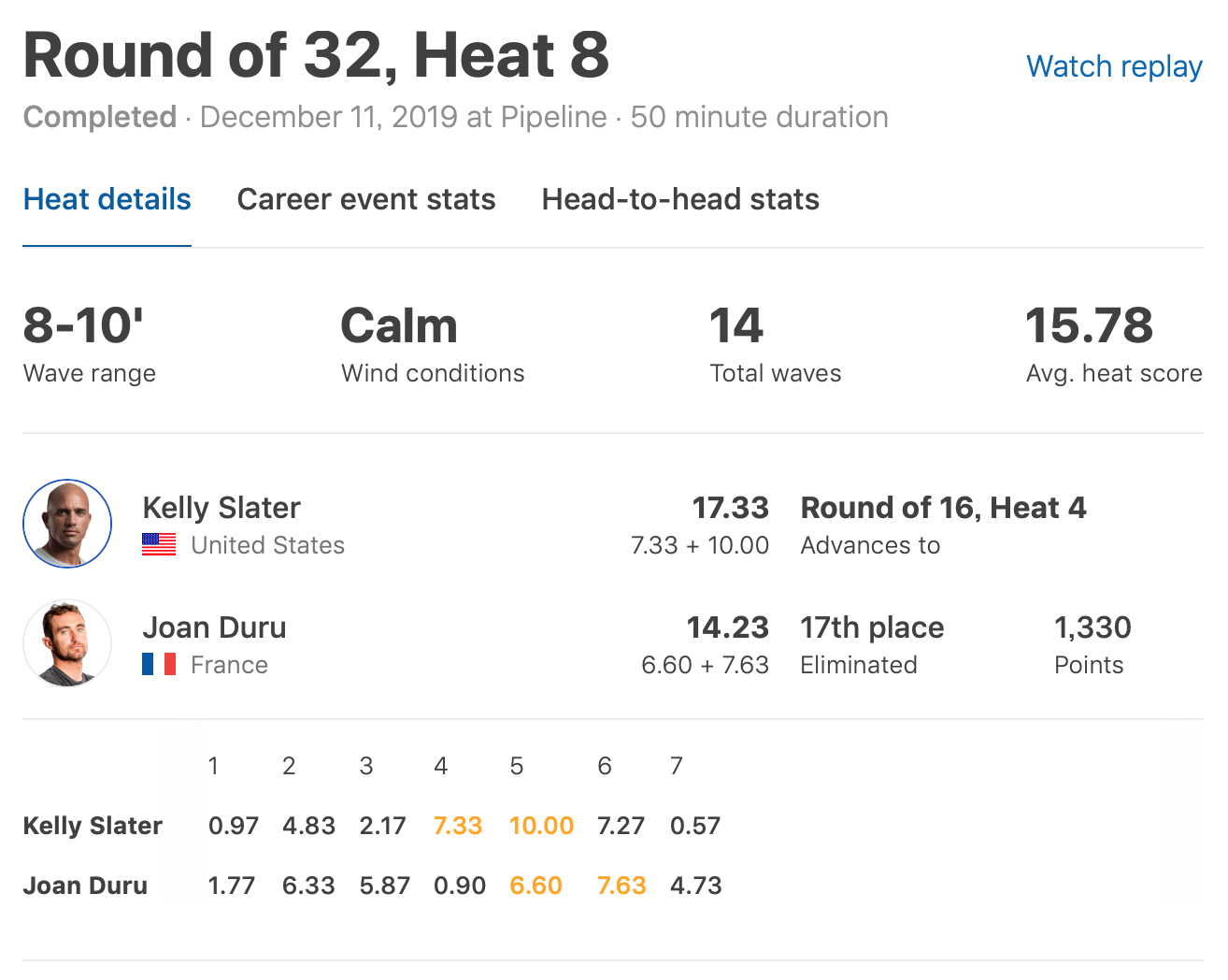 さらに注目のワールドタイトル争いは、ヒート5でFilipe ToledoがRichardo Christieに、ヒート13ではJordy SmithがJesse Mendesに敗退。