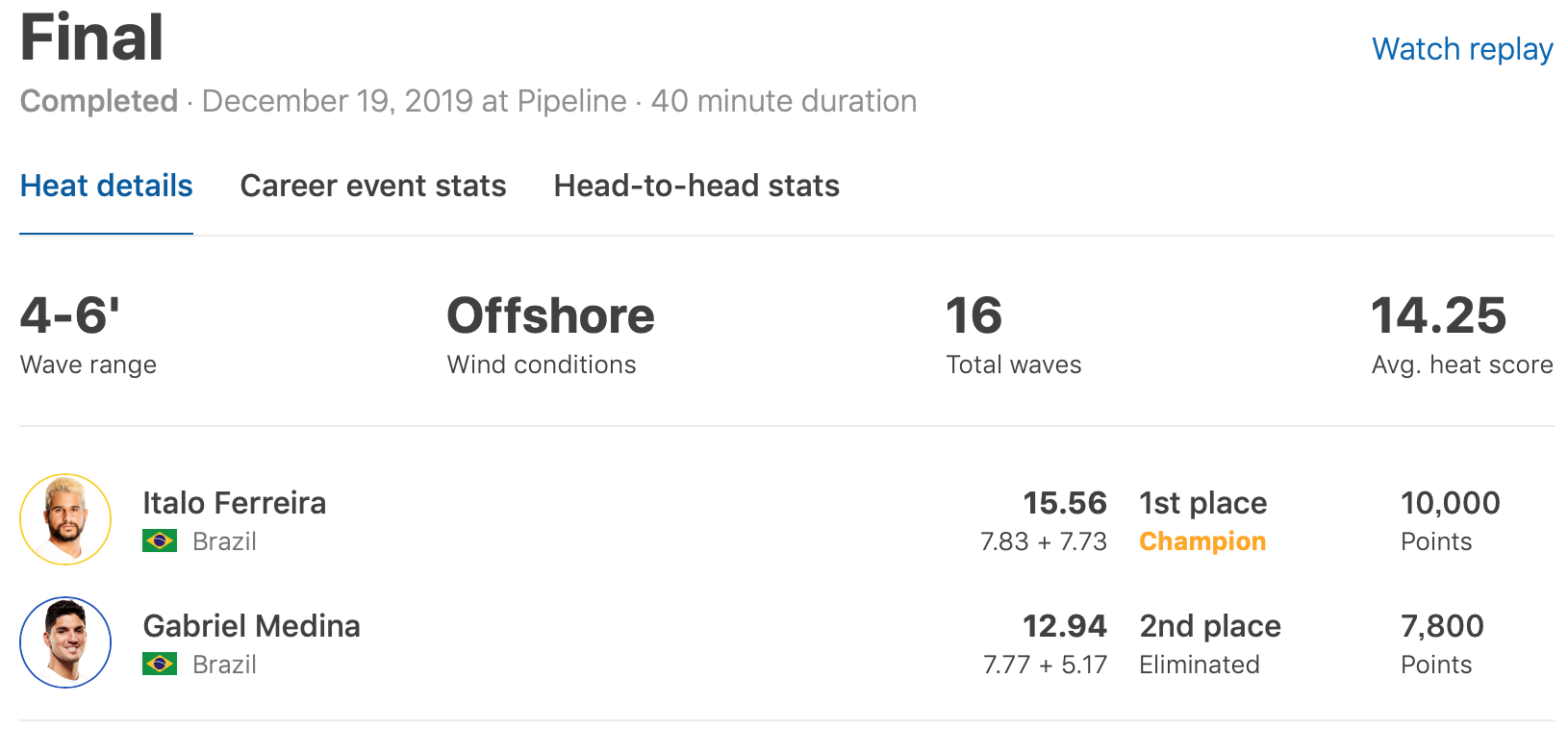 「信じられない、普通じゃないです。」Italo Ferreiraは言った。「ひとつのトロフィーを手に入れるために自分の人生を捧げると決めてやってきました。トレーニングと自分のボードをテストするために大会の一月前からハワイ入りしました。なのでこのトロフィーには自分にとって意味のあるものであると同時に言葉になりません。Kelly Slater、Gabriel Medina、Yago Doraをはじめ、この大会を通して戦ったみんなとのヒートは本当にいいヒートでした。みんなから本当に多くの力をもらえたからこそ、毎日頑張ることができました。今シーズンは本当にいろんな意味でアップダウンが激しいクレイジーな年でした。今大会が始まる前、本当に今大会で優勝したいと強く思いました。そして今、その勝利を手にすることができました。今年は本当に自分にとって特別な一年になりました。本当に全てに感謝してます。」