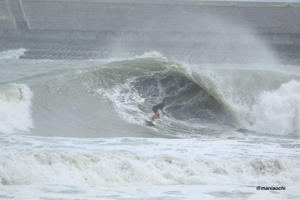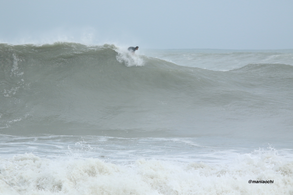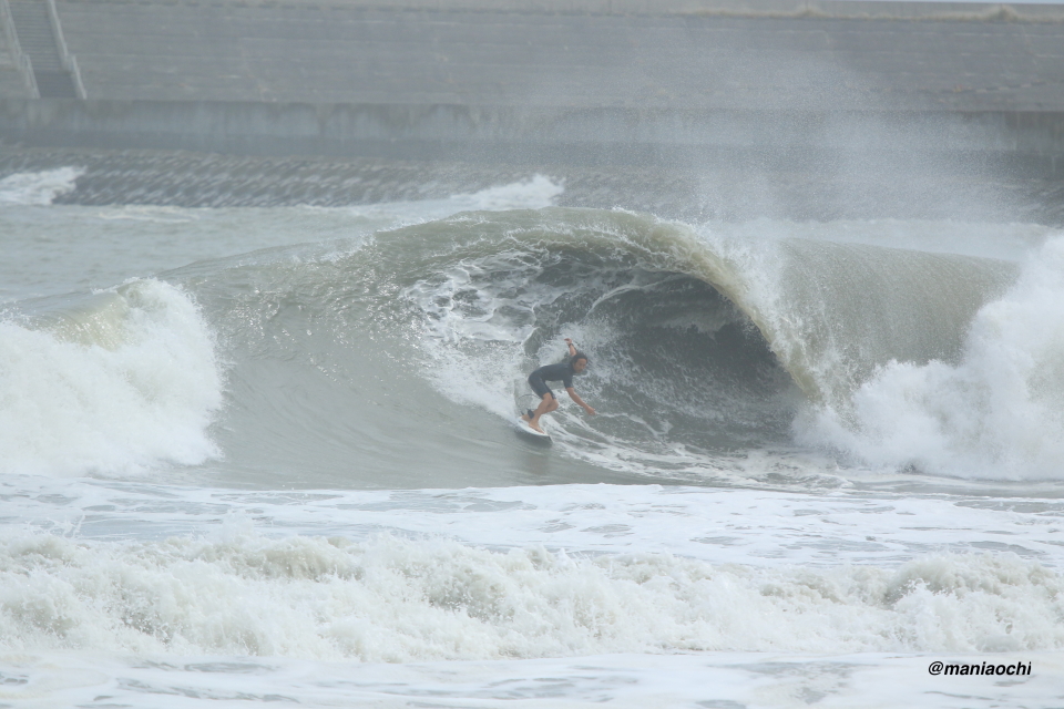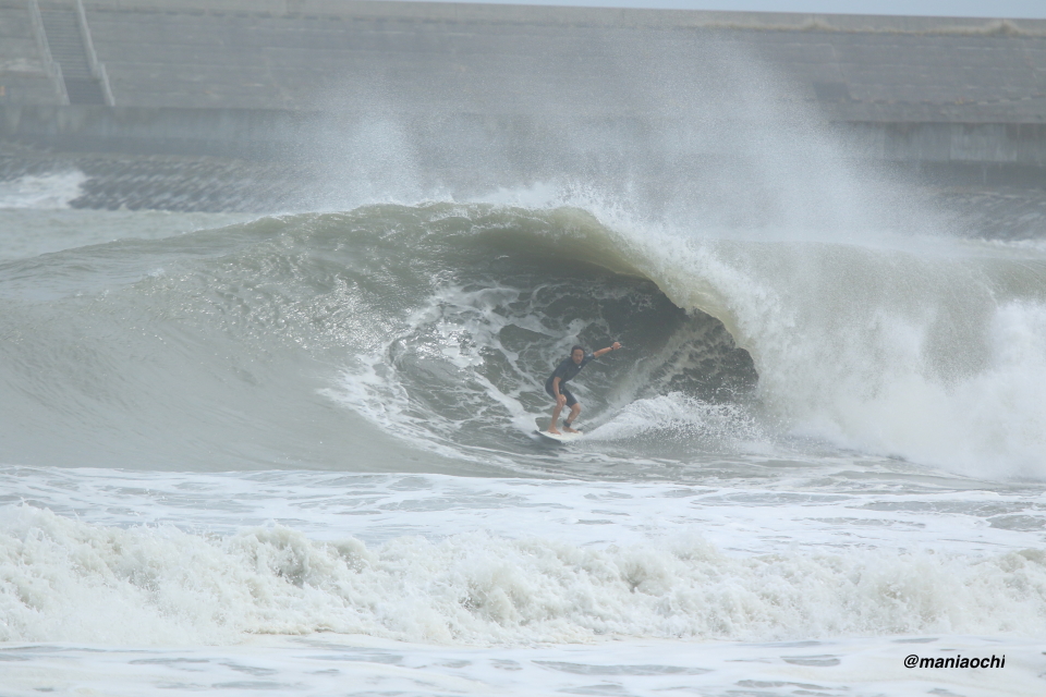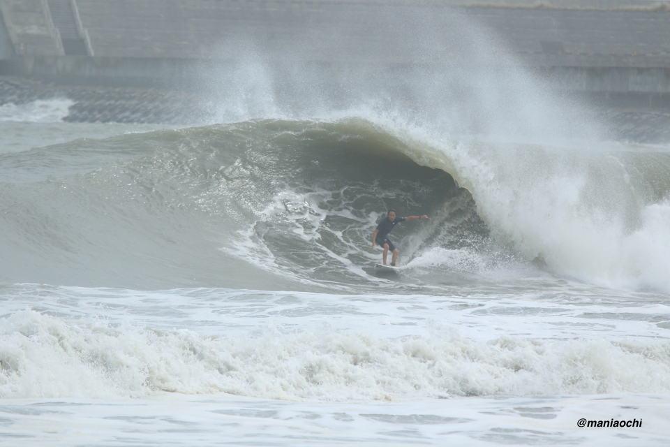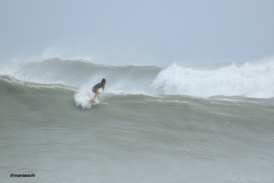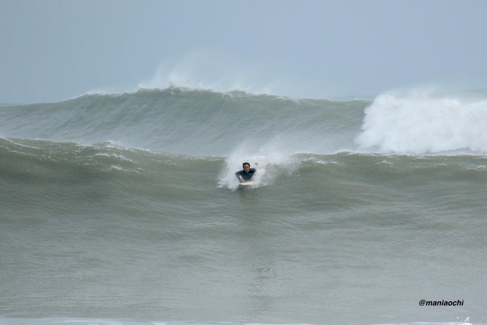 ドカ掘れセクションから外れ一人でアウトから割れる巨大なセットを狙に出た 辻 裕次郎プロ。板のセレクトに悩んだが6フィート代の長さの板に交換するもテイクオフからの滑り出しに短さを感じ7フィート代の板が必要と感じていたが今回は持ち合わせておらず満足のいくチャージができず残念がっていた。それでけにこのアウトからの巨大セットの大きさと水量と厚みを感じる。