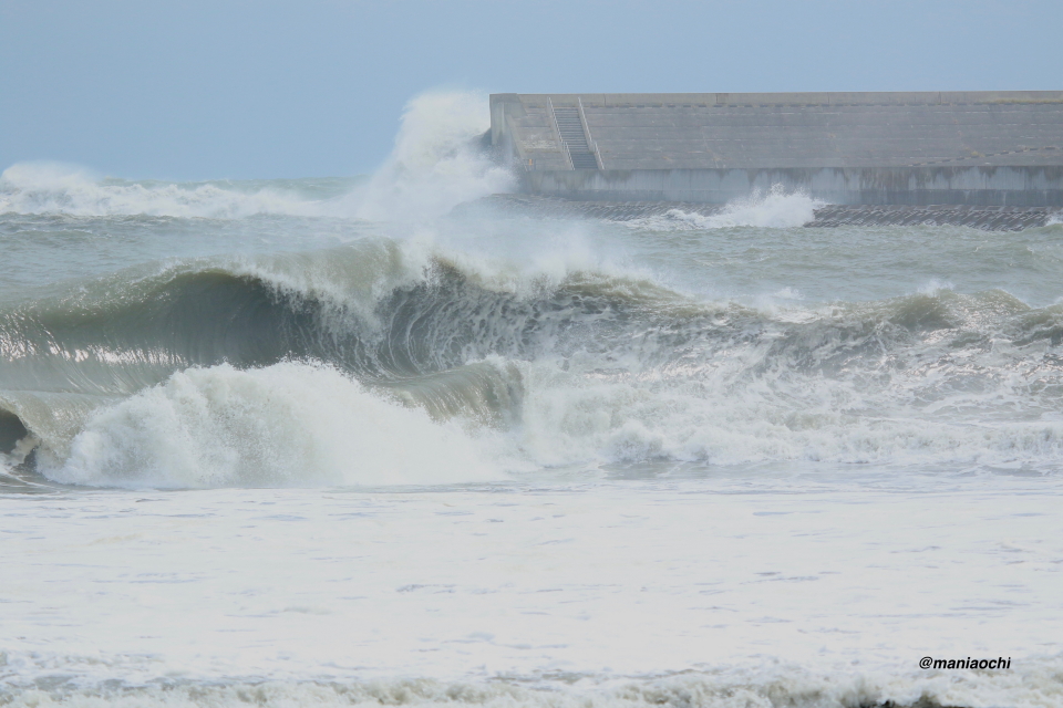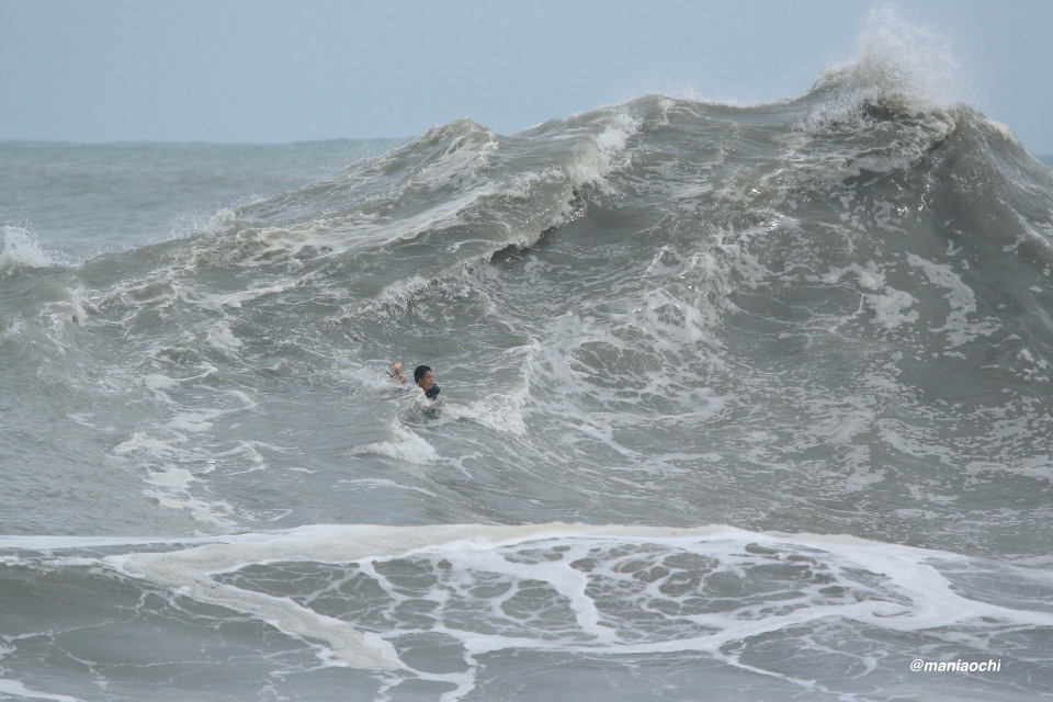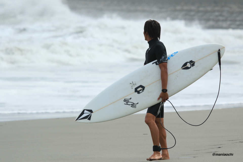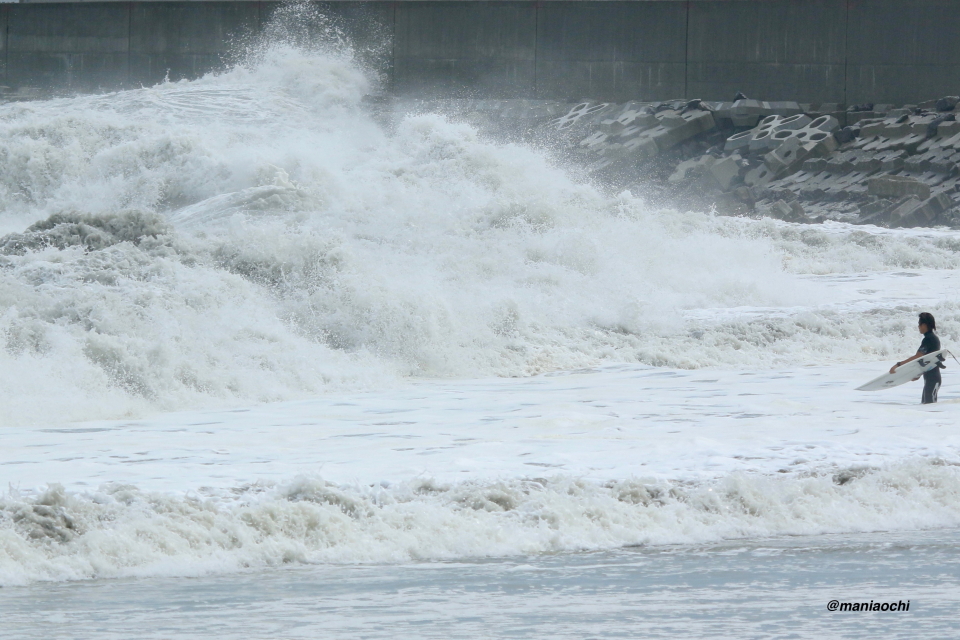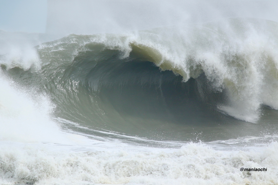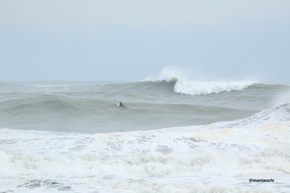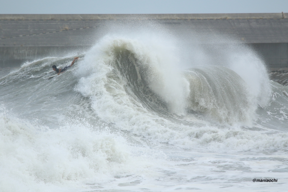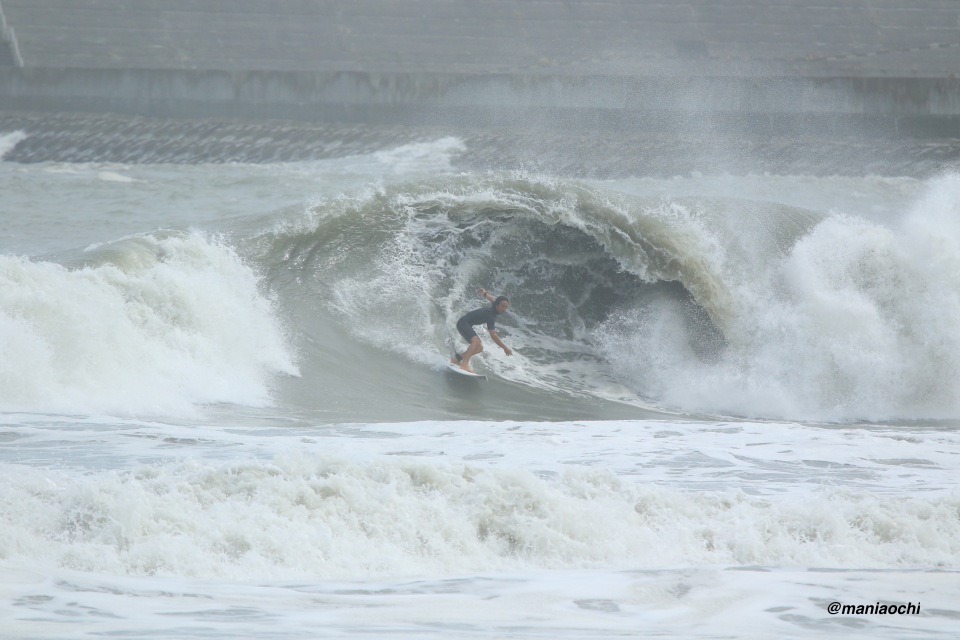 ドカ掘れセクションから外れ一人でアウトから割れる巨大なセットを狙に出た 辻 裕次郎プロ。板のセレクトに悩んだが6フィート代の長さの板に交換するもテイクオフからの滑り出しに短さを感じ7フィート代の板が必要と感じていたが今回は持ち合わせておらず満足のいくチャージができず残念がっていた。それでけにこのアウトからの巨大セットの大きさと水量と厚みを感じる。