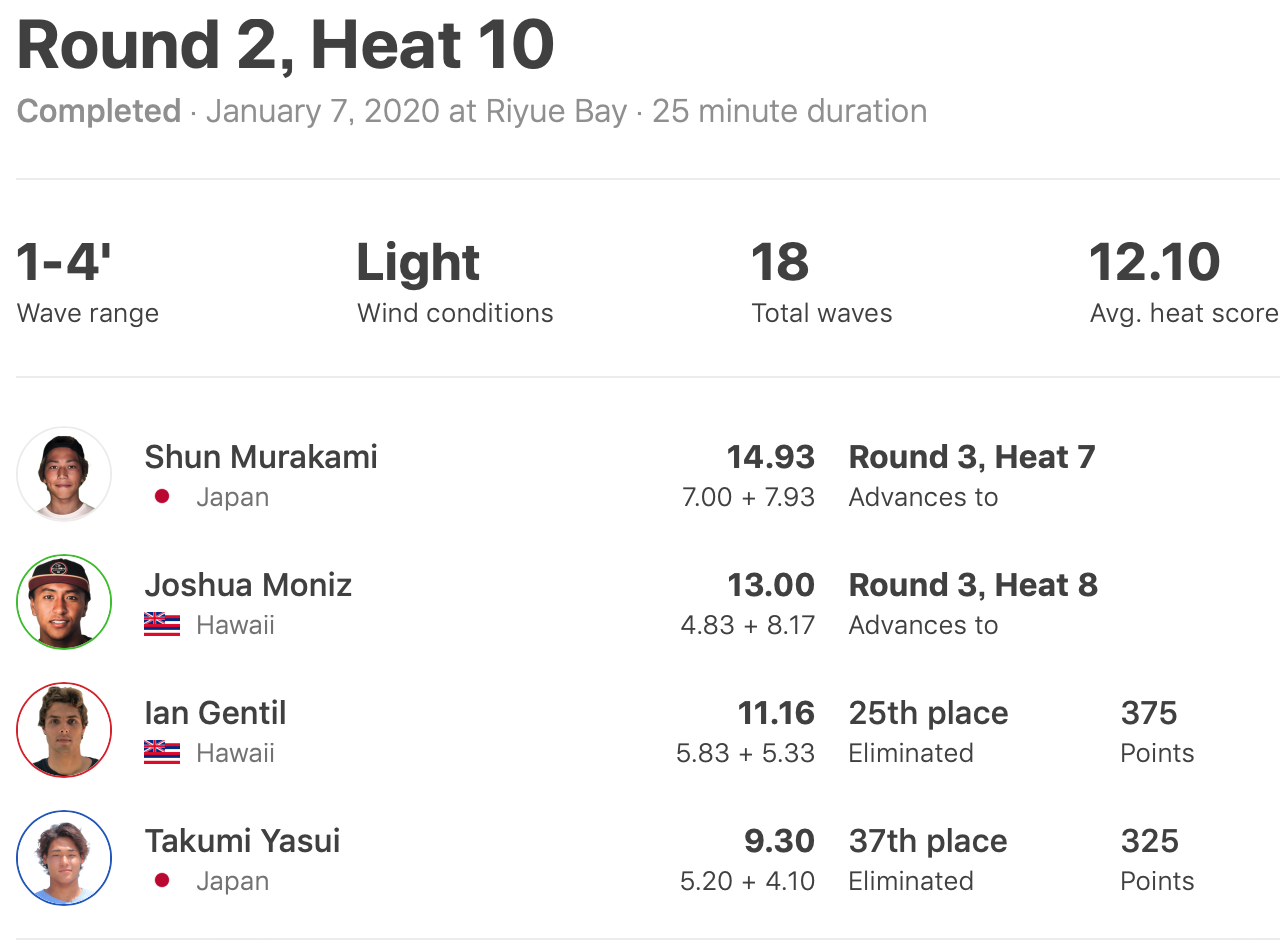 元CTサーファーのJoan Duruがヒート1から素晴らしいパフォーマンスを見せてスタートとなった中、注目の日本人選手たちの活躍は、この日のハイエストスコア14.93ptをマークした村上舜、ハイエスト・シングルスコアとなる8.17ptをマークした大原洋人をはじめとした総勢7名の日本人選手がラウンド3進出!