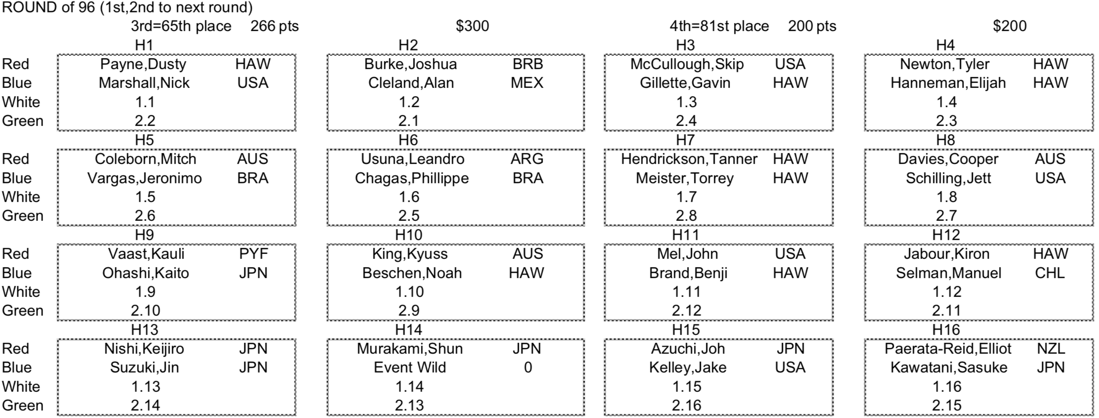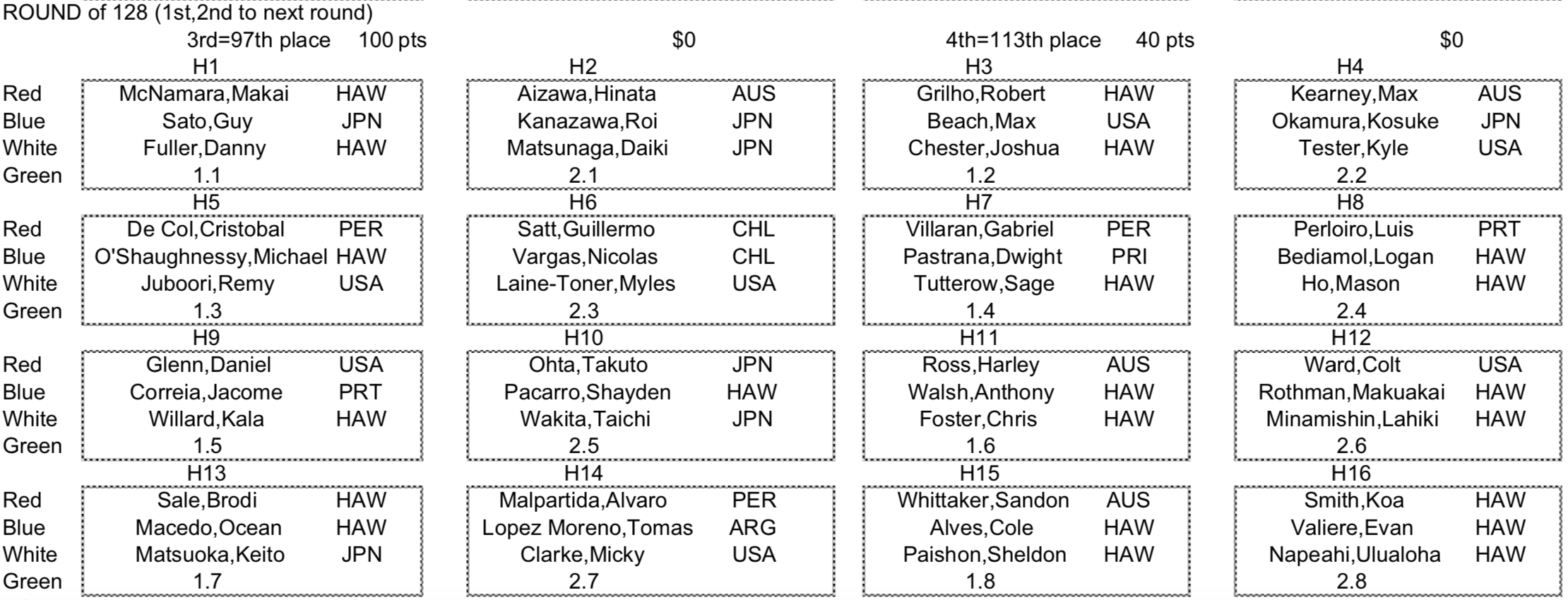 ラウンドオブ144となるハワイアントライアルラウンド終了後に行われる予定のラウンドオブ128では、ヒート1に佐藤魁、ヒート2に相澤日向と金澤呂偉、ヒート4に岡村晃友、ヒート10に太田拓杜と脇田泰地、ヒート13に松岡慧斗が出場。
