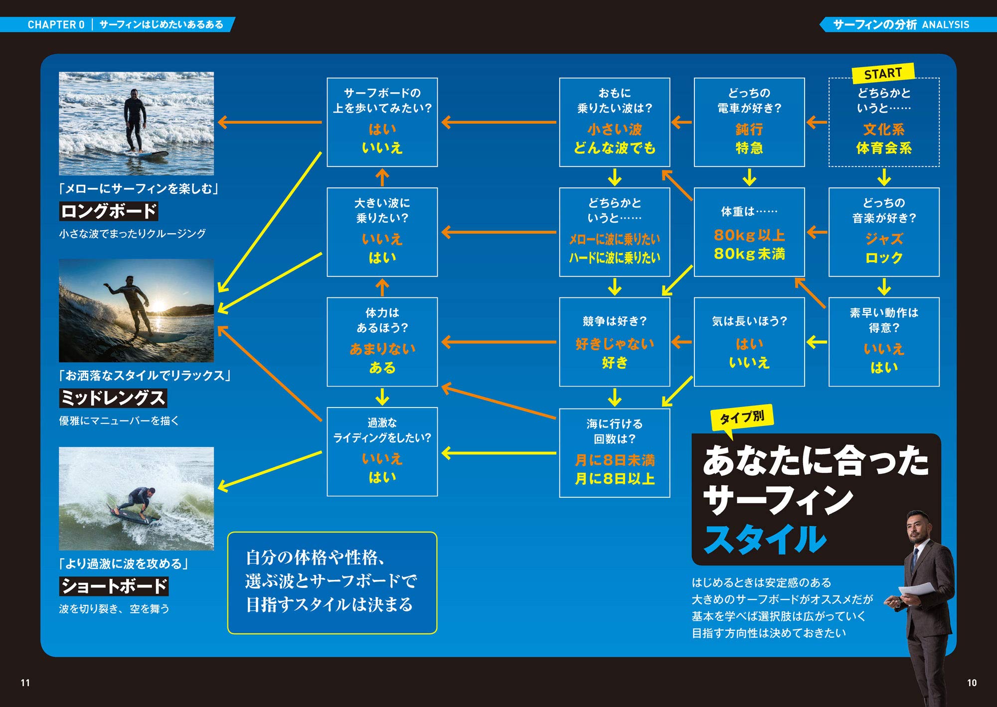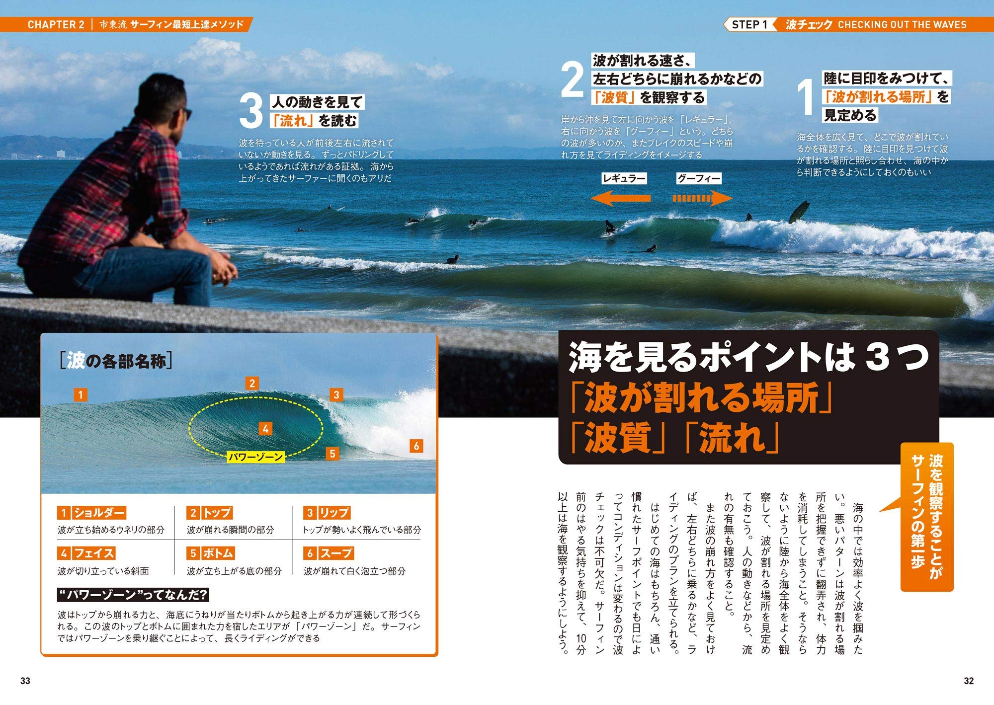 本誌は大きく分けて6つのチャプターに分かれており、サーフィンをはじめたいと思っているけどなかなか踏み出せない人に向けた”サーフィンはじめたい あるある”から、はじめるにあたって実際にぶつかる”素朴な疑問編”、そして格言で覚える市東流”サーフィン最短上達メソッド”、PESと市東重明の対談形式でわかりやすく進行していく”中級者テクニック編”、さらにサーフィンはうまさだけではないという真髄をついた”かっこいいサーファーになるために”に加えて、”サーフィンの知識袋”といった大きなテーマの中にそれぞれ細かいカテゴリーを詳しく解説する形で構成。