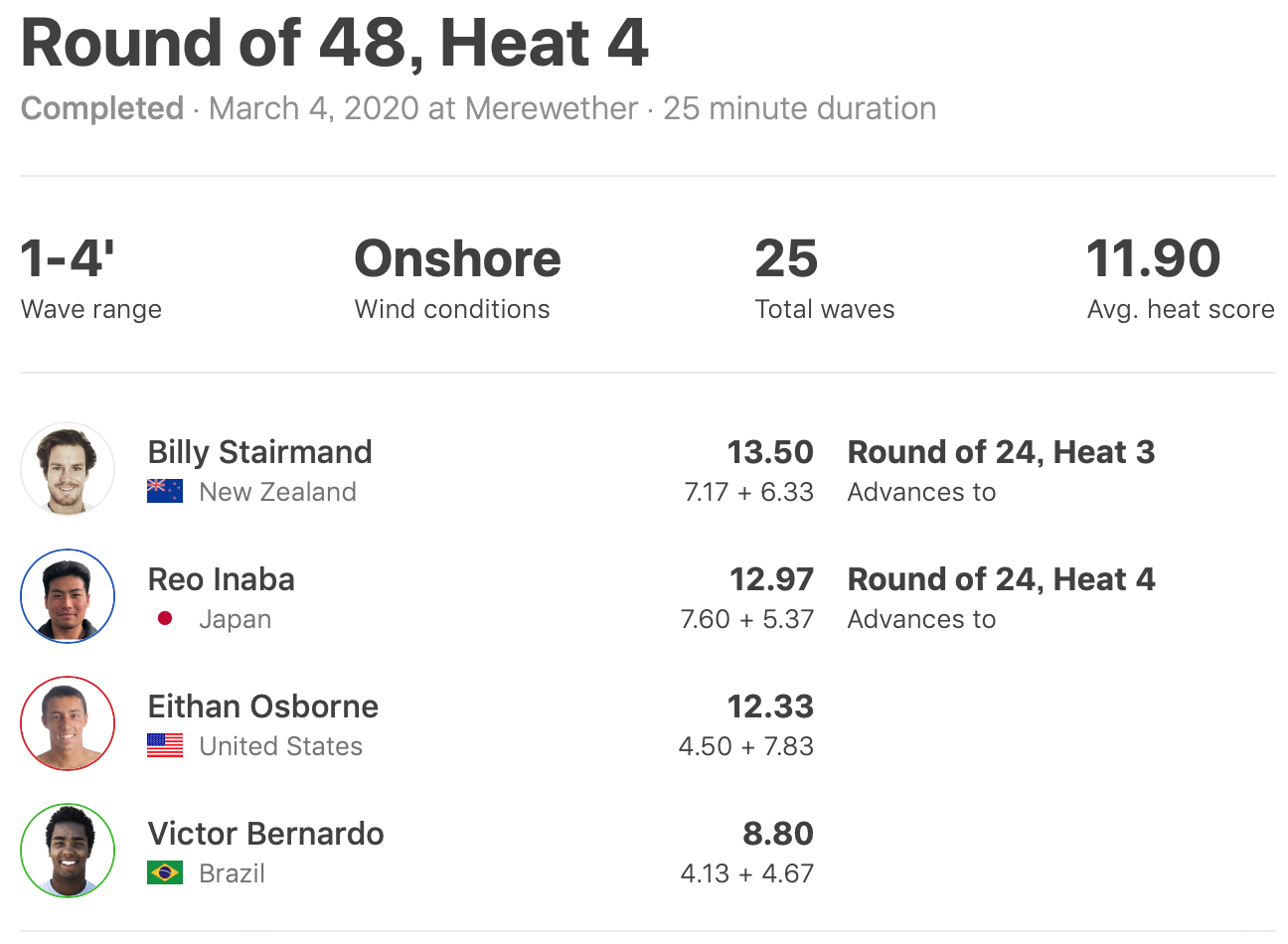 Eithan Osborne、Victor Bernardo、Billy Stairmandと対戦となったラウンド3のヒート4では、パワフルなバックサイド・サーフィンが炸裂し、ヒートのハイエストスコアとなる7.60ptをマーク!