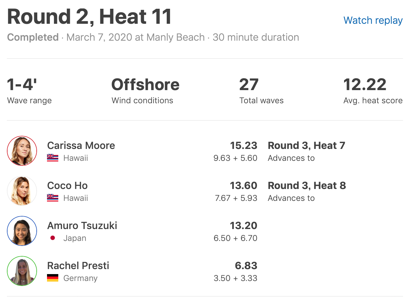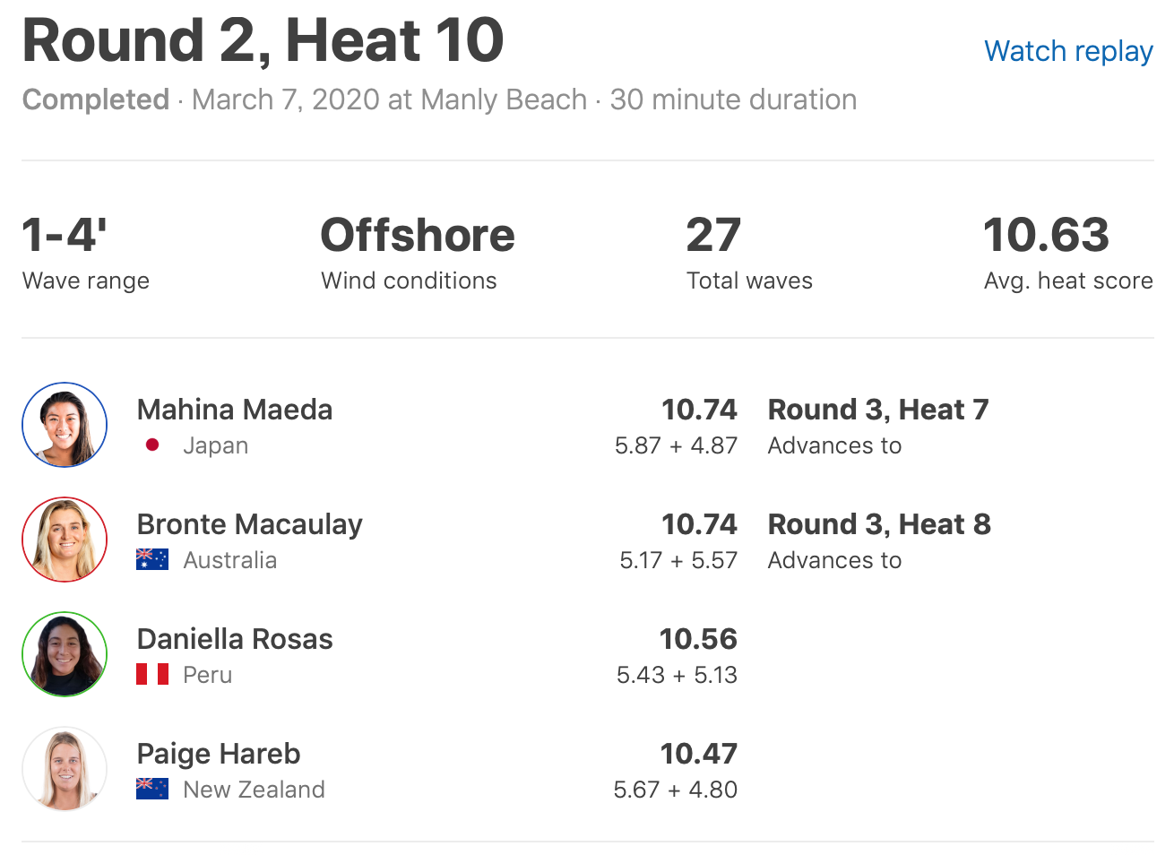 現地時間と日本時間の3/8(日)はラウンド2の全ヒートが消化された中、注目の日本人選手たちの活躍は前田マヒナのみがラウンド3進出となった。