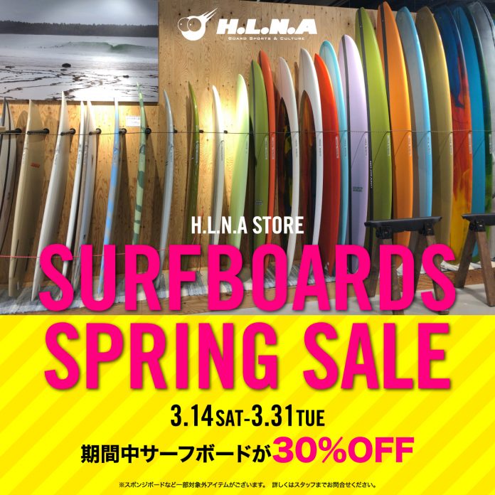 H.L.N.A STORE全店にて、3/31(火)までの期間限定で対象商品となるサーフボードが30%OFFでゲット可能な春のサーフボードセールを実施中!!