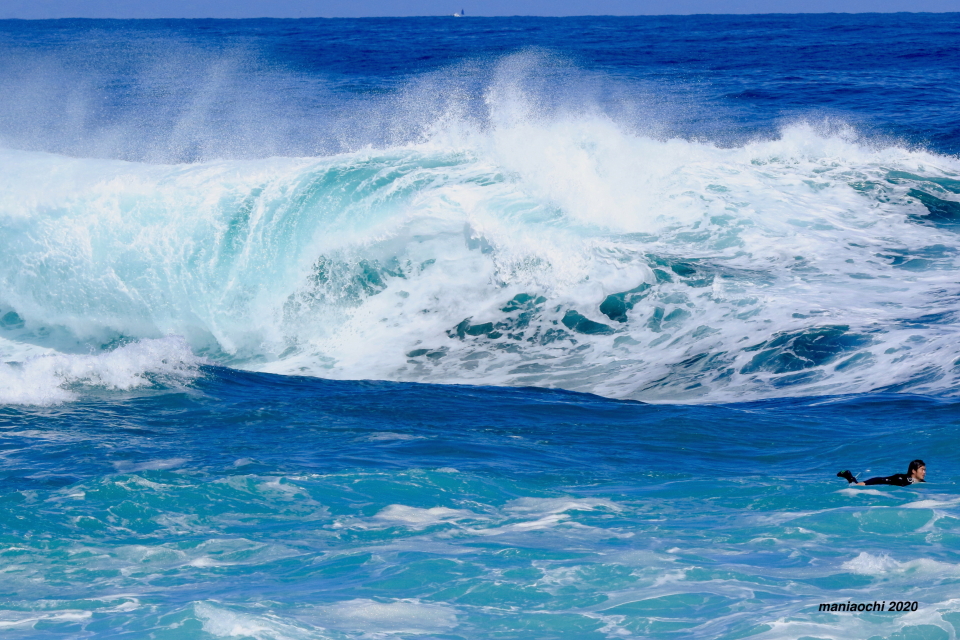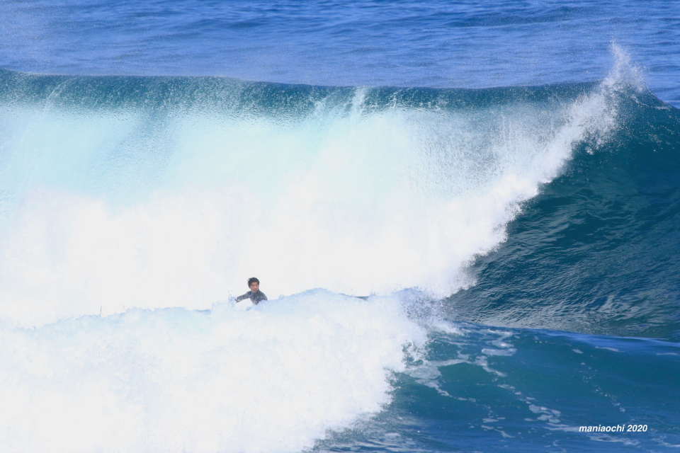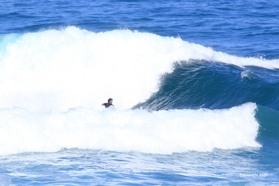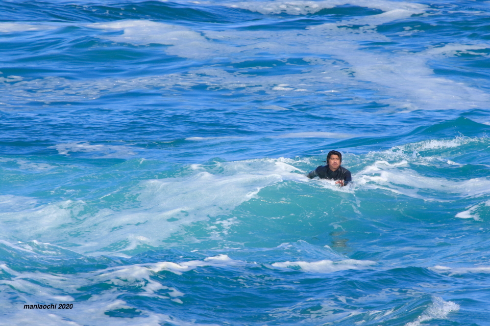 狙えるかどうか状況を知るためにとりあえず入水した松岡プロ。陸から見ているよりもハードですよ!入水したらカレントと言う表現よりは海全体が動いていいてなかなかテイクオフポジションをキープできず狙えそうなライトのドカ掘れブレイも狙うに狙えない今回の状況でライト方向を狙うにはインパクトをもろに喰らいそうなリスキーな状況だった。通い慣れた松岡プロでさえ午前中はテイクオフポジションをキープするのが大変であった。