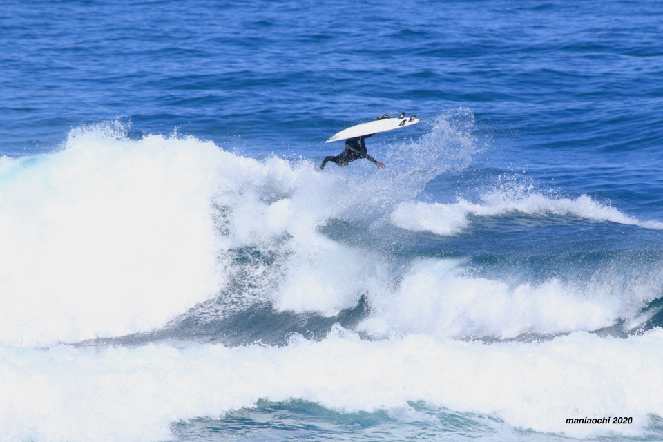 松岡プロのアドバイスの元、ここのポイントは初チャージとなった大橋海人プロ。テイクオフポジションやブレイクのタイミングを探りながらのスタート。大橋プロ曰く日本のポイントでもここの波は怖さを感じますとの事。