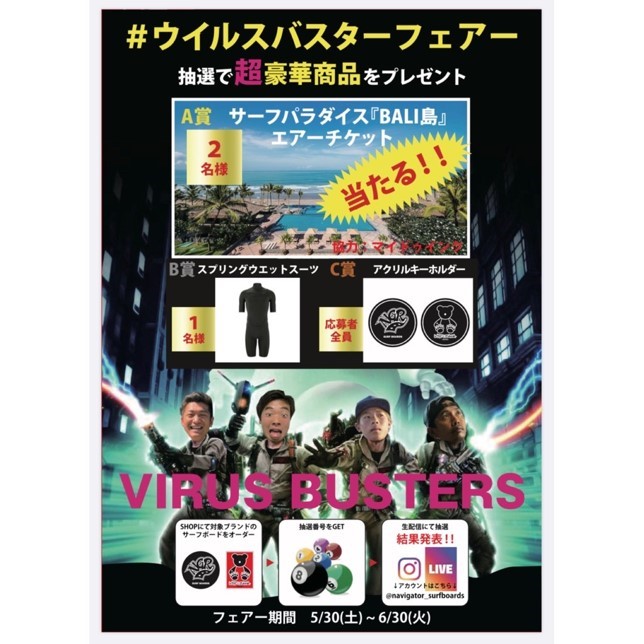 緊急事態宣言が解除されたことを記念し、NAVIGATOR surfboardsが、限定50本のみとなる小波用EPS製サーフボード”SEA DOG”モデルをオーダーしたお客様に抽選でバリ航空券やスプリングスーツほか豪華商品が当たるスペシャル・キャンペーン”VIRUS BUSTERSキャンペーン”を5/30(土)から6/30(火)までの期間に渡り開催することが決定!
