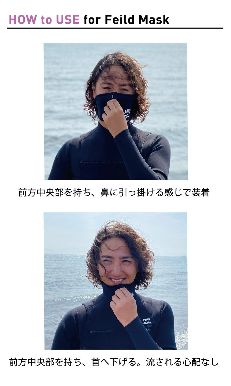 また、はずしている間はネックウォーマーのような状態となるので、不意に食らった波によってマスク自体が流される心配もない優れものとなっている!!