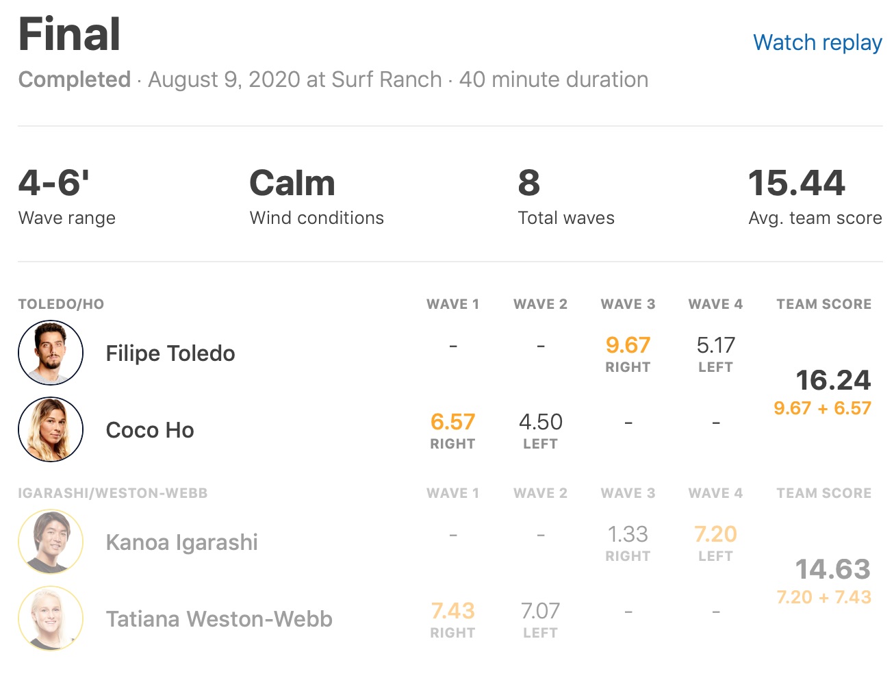 1: Coco Ho and Filipe Toledo (16.24)
