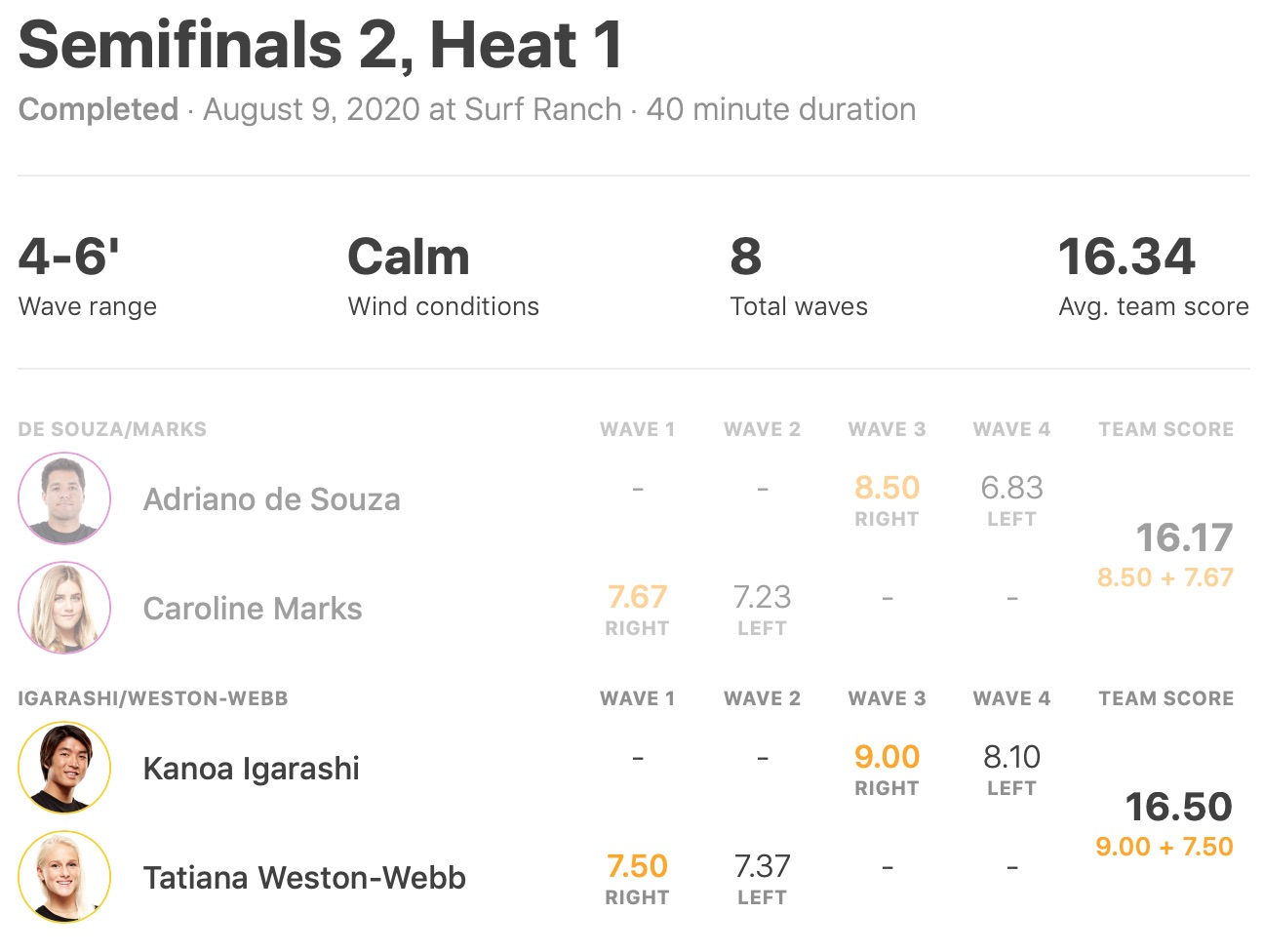 SF 2: Tatiana Weston-Webb and Kanoa Igarashi (16.50) def. Caroline Marks and Adriano de Souza (16.17)