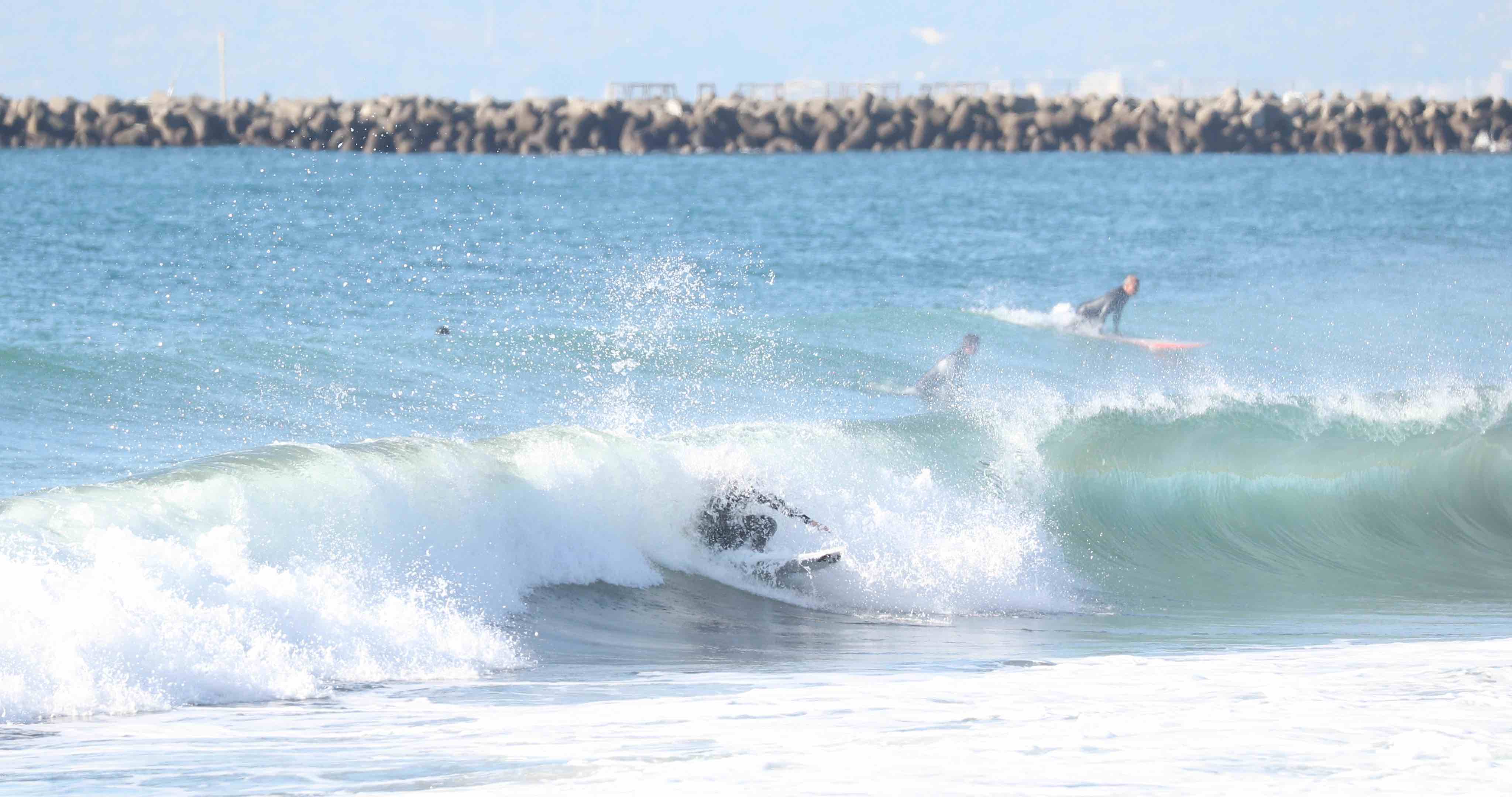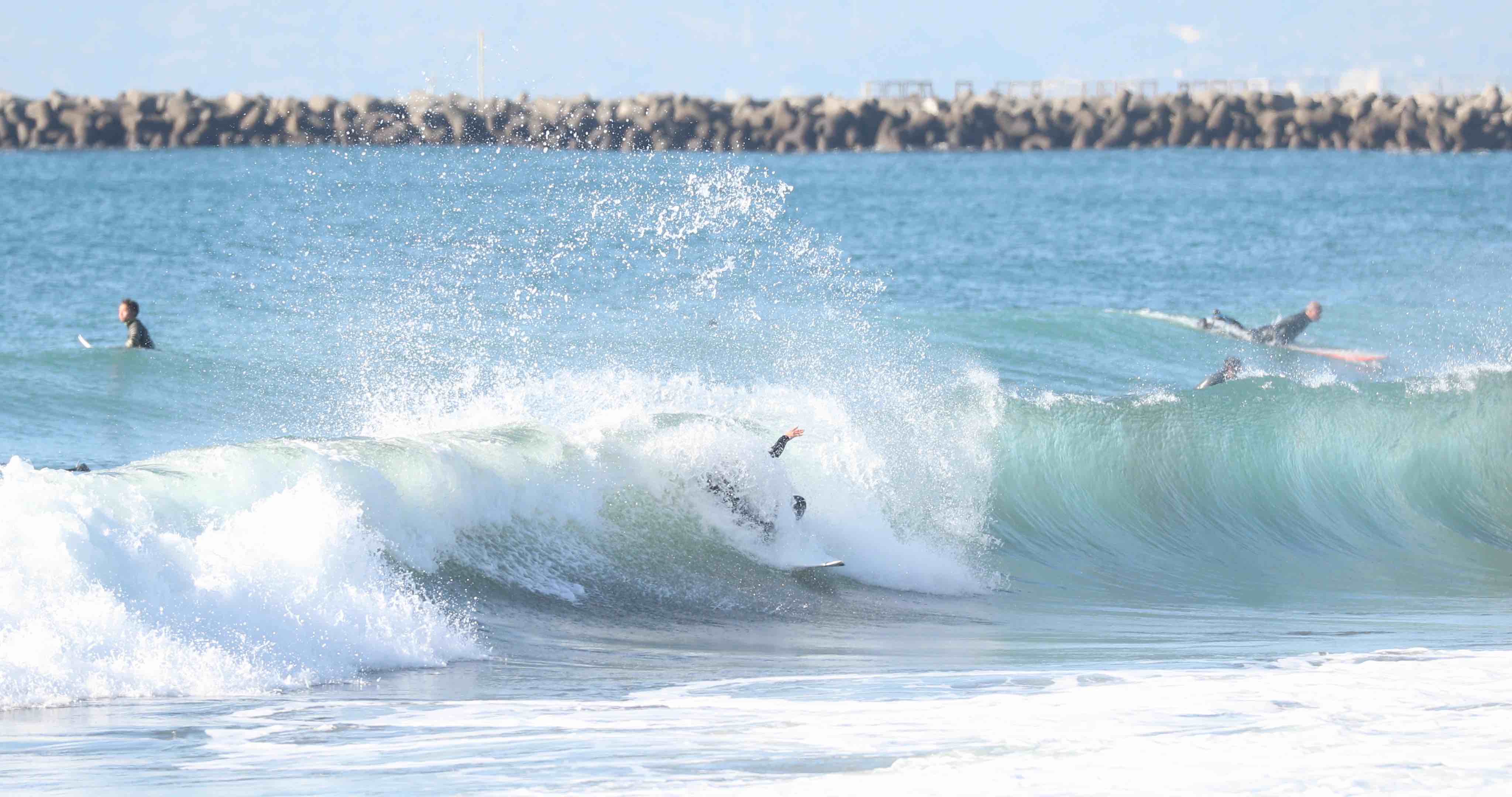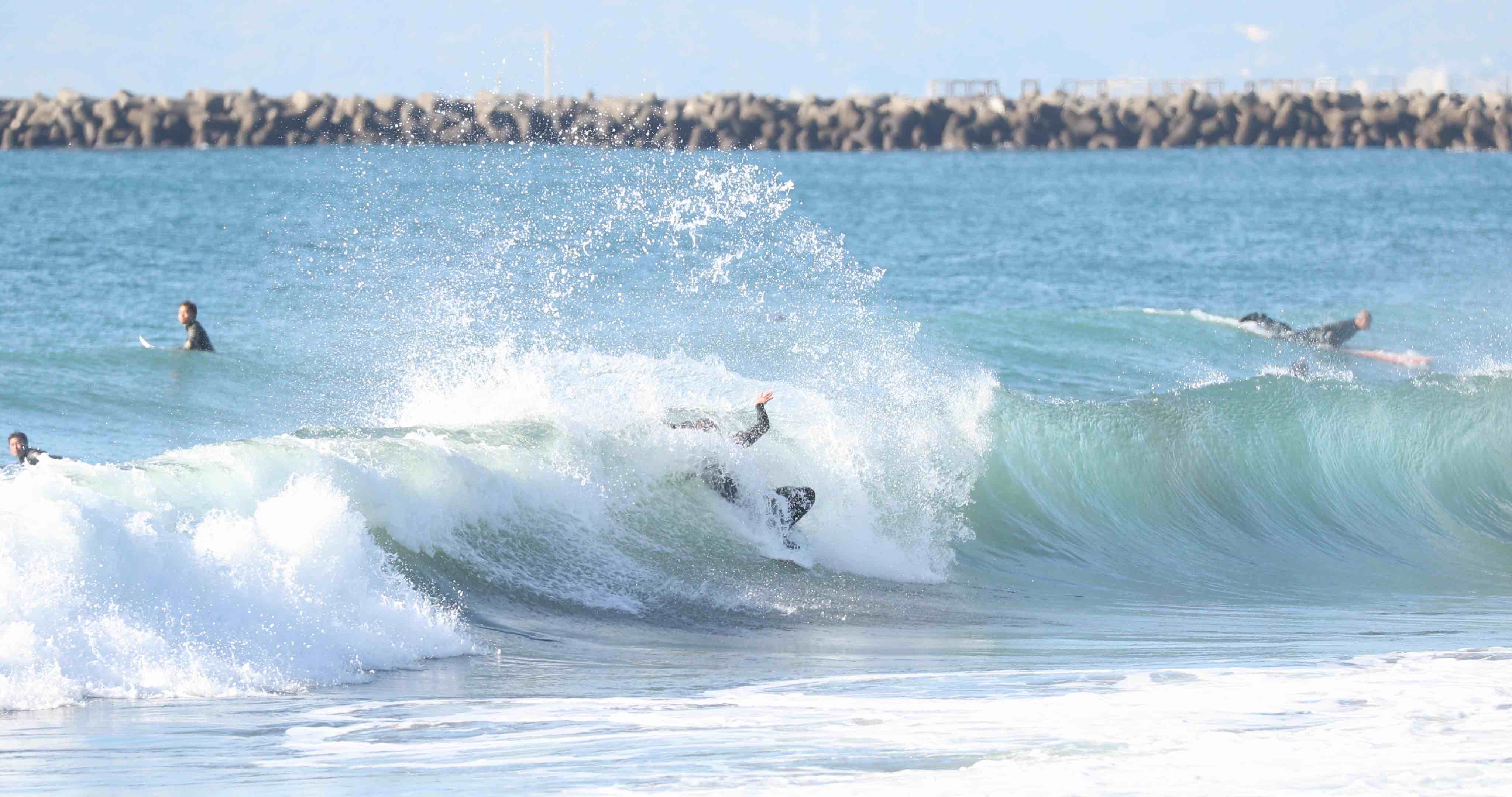 西高東低の気圧配置により、南西のオンショアによって連日サイズのある波をキープし、風が変わるタイミングを狙えばグッドコンディションにも恵まれた湘南エリア。
