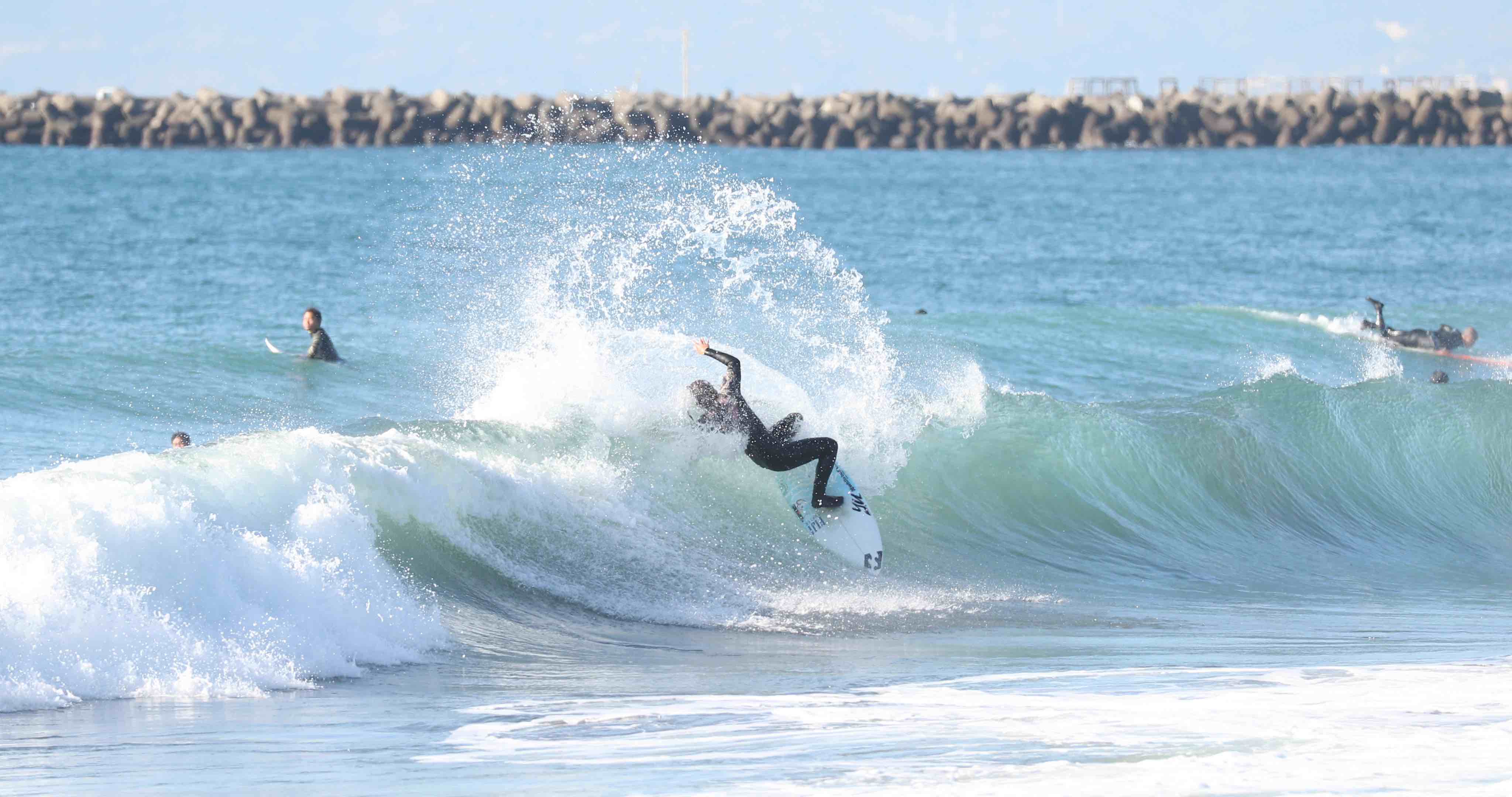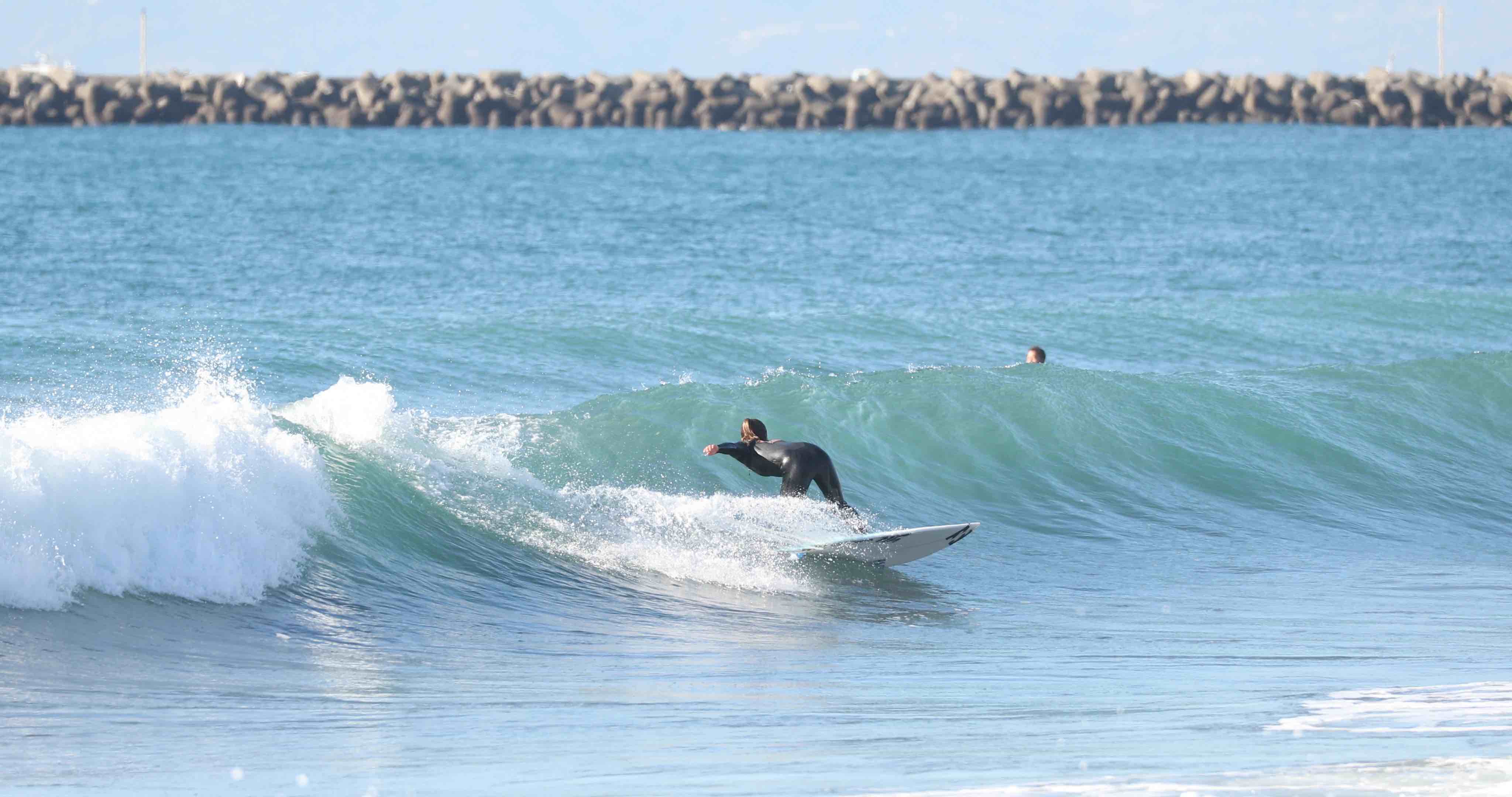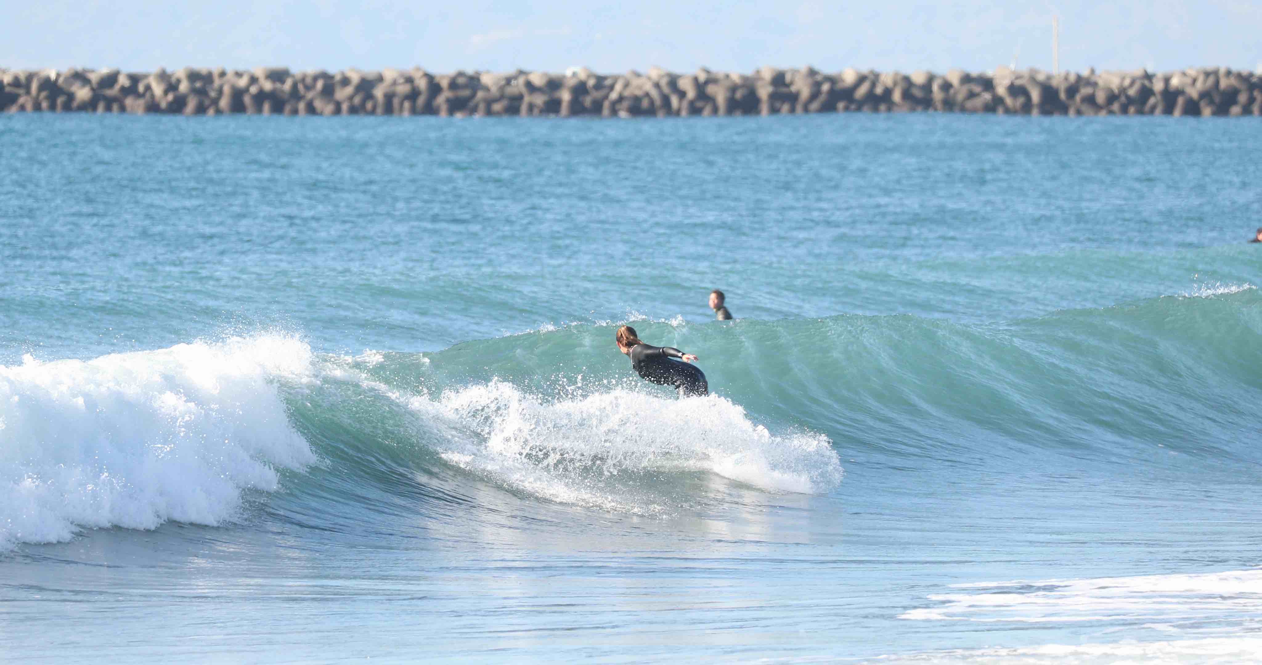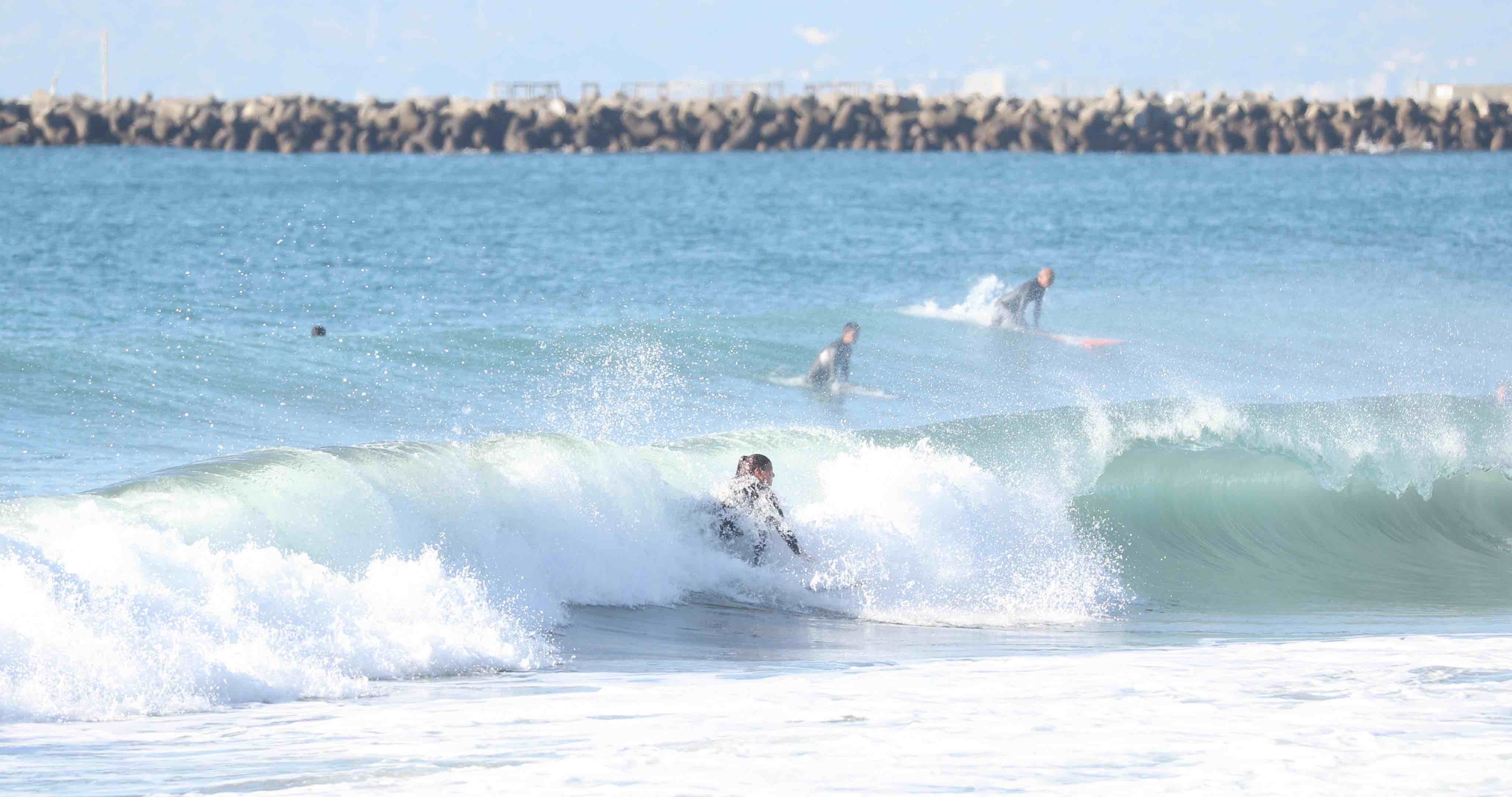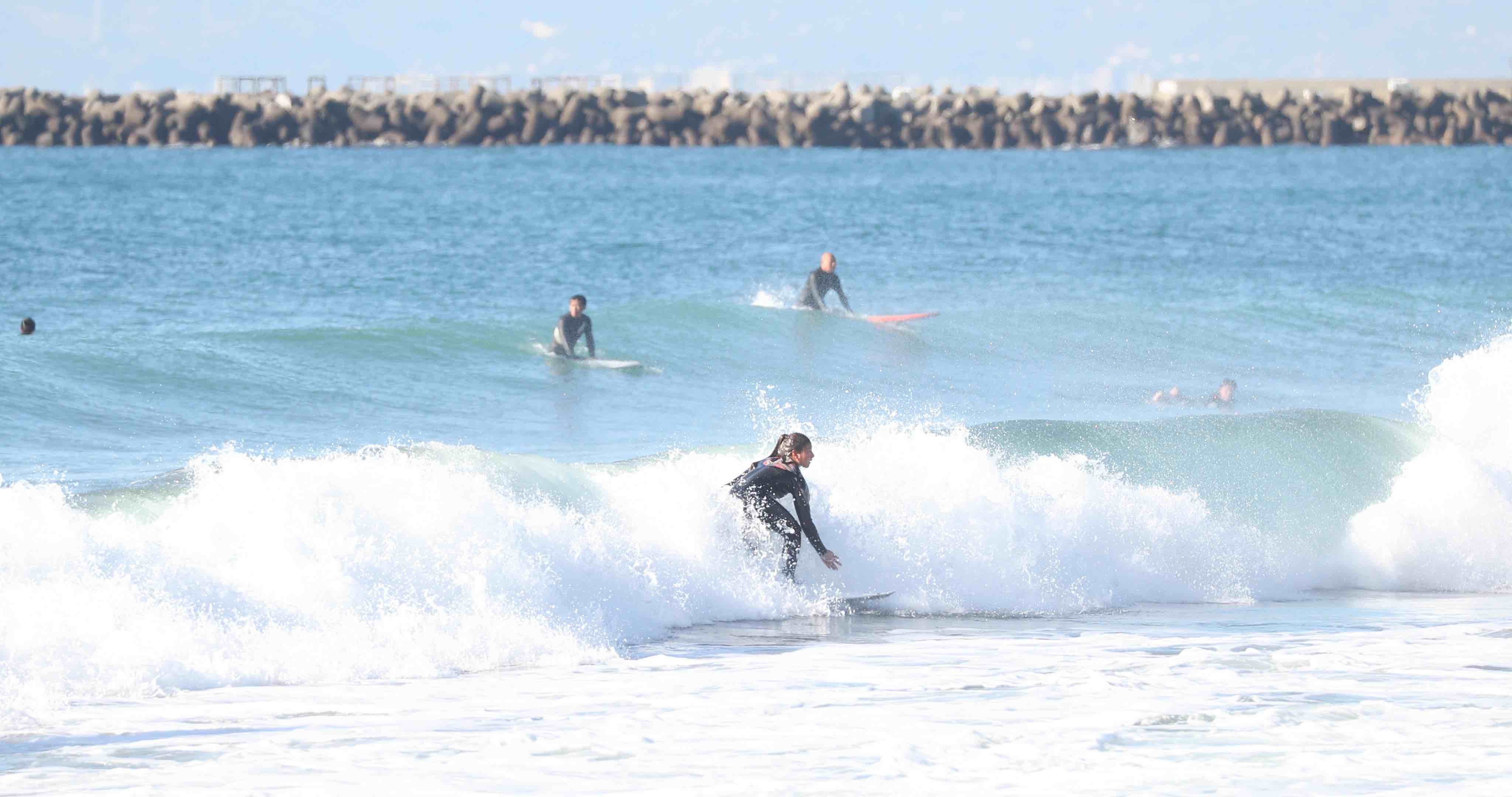意外にもサイズが残り、オフショアスタートとなった1/10(日)の朝から午前中は形のいい波が押し寄せ、全域に渡ってサーフィンを楽しむことができた。