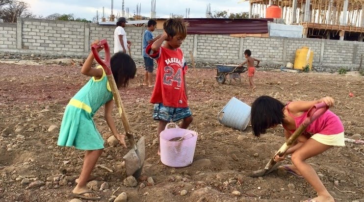 それからも作業は延々と続き、大きな子供が指揮をとり、小さな子供たちは土が入った重たいバケツを引きずって運び、運ばれてきた大量の土を平らにならし、重たい石をみんなで力を合わせて運び、深い穴を掘り続けた。