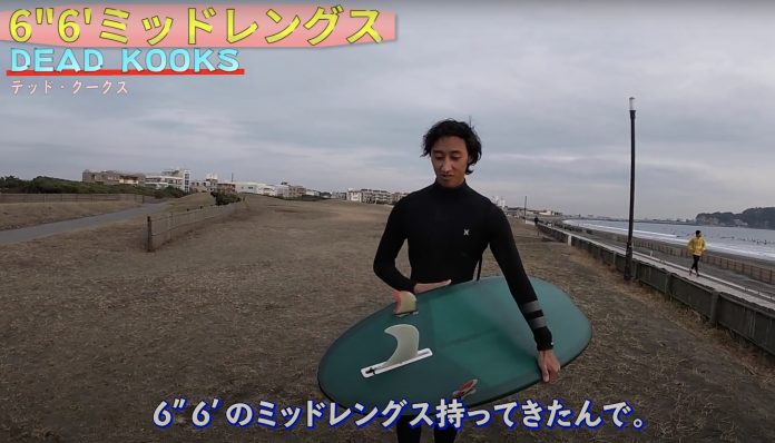 年明け早々に吹いた南西の強風で砂を持っていかれて以来、地形の悪い状態が続いている鵠沼の沖で割れて途中で消える誰もが苦戦する波を相手に、河村海沙が持ち出したのはDEADKOOS surfboardsのミッドレングス。