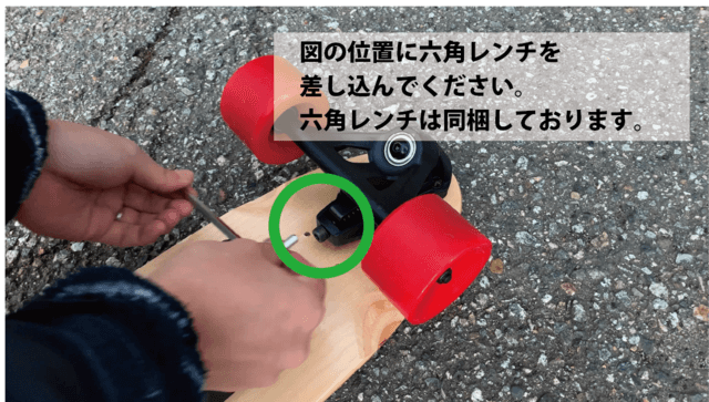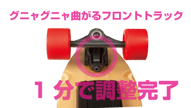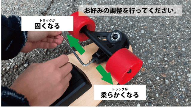 フロントトラックには、付属の専用六角レンチで好みの硬さを調整できるサーフスケート用の曲がるトラックを採用。