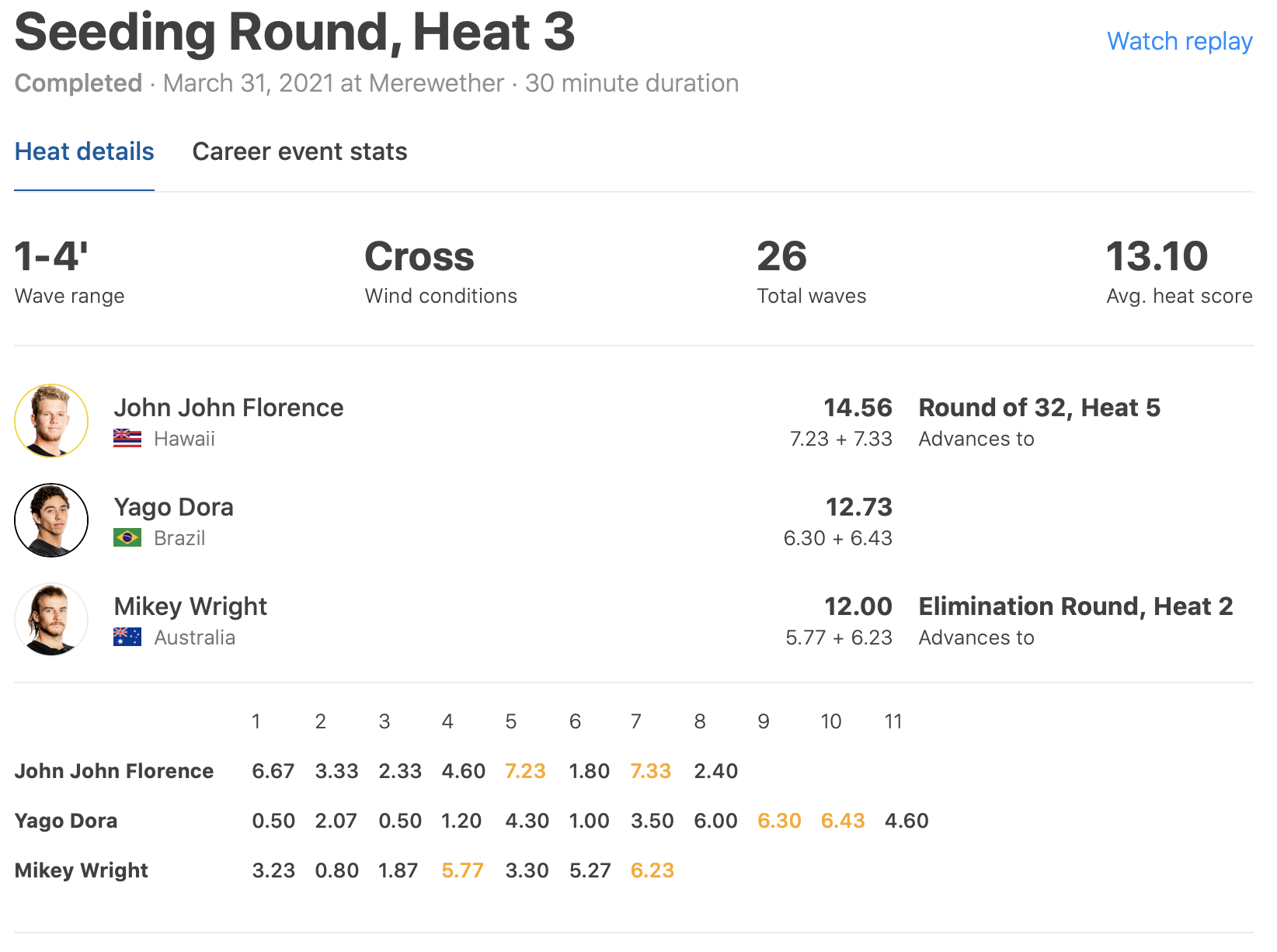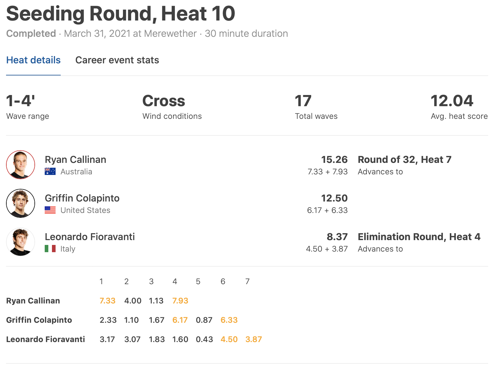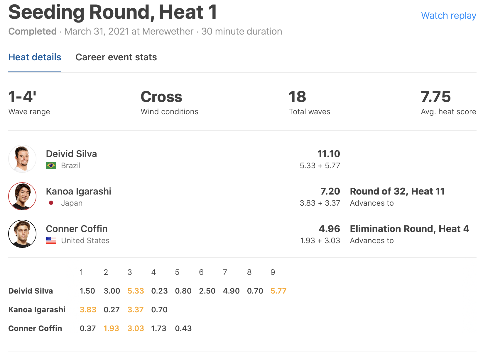 世界トップが集まるこのハイレベルな戦いの中、他の選手たちよりもひと伸びもふた伸びもあるドライヴィーかつ切れ味鋭いターンを連発し、Ryan Callinanに次ぐトータルスコア14.56ptを叩き出して余裕のラウンドオブ32進出を決めた。